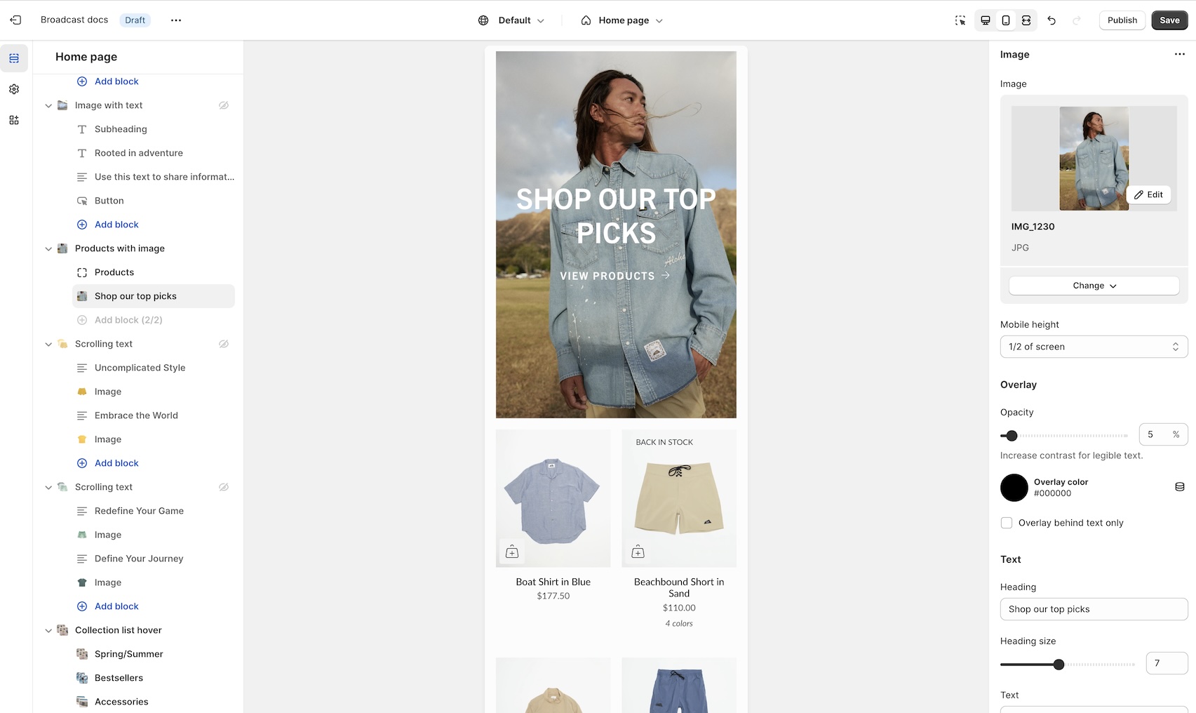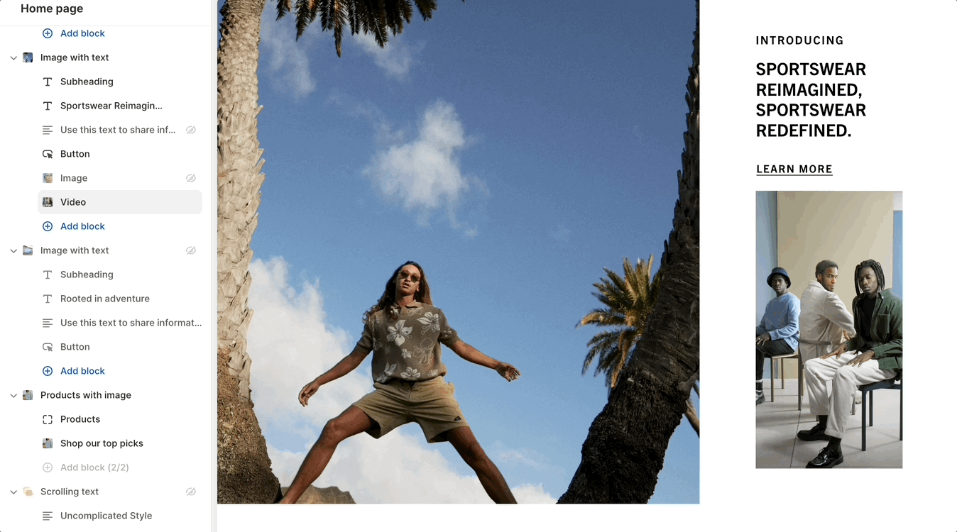 The main image is configured in the section settings. The image block will add an image to the text area. Drag the image or video block to sort placement position in the text area.