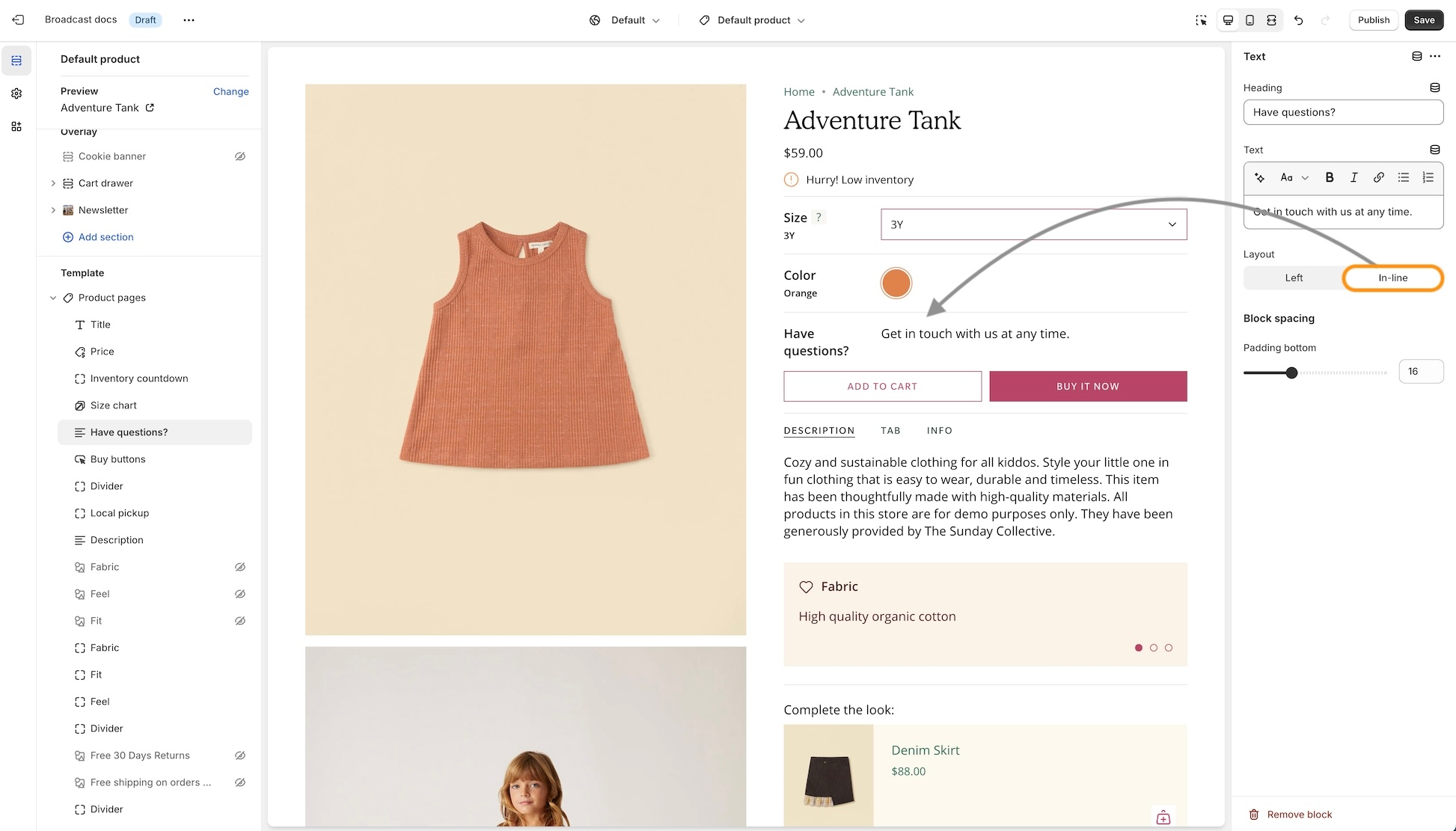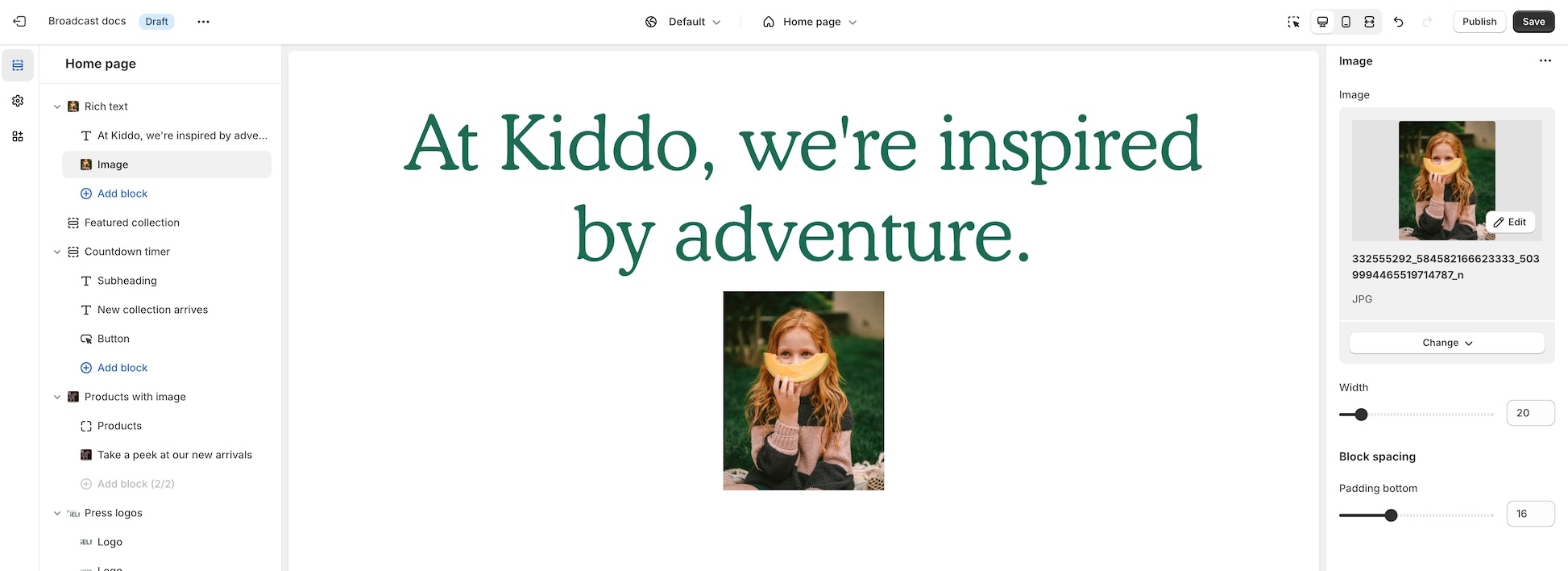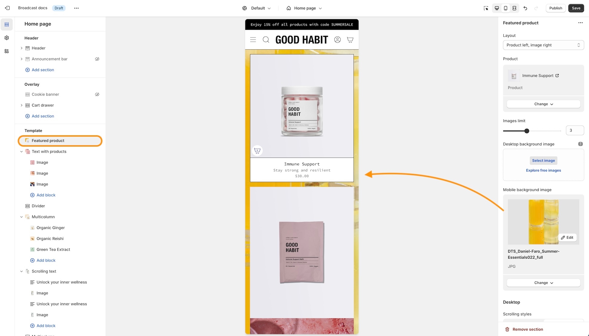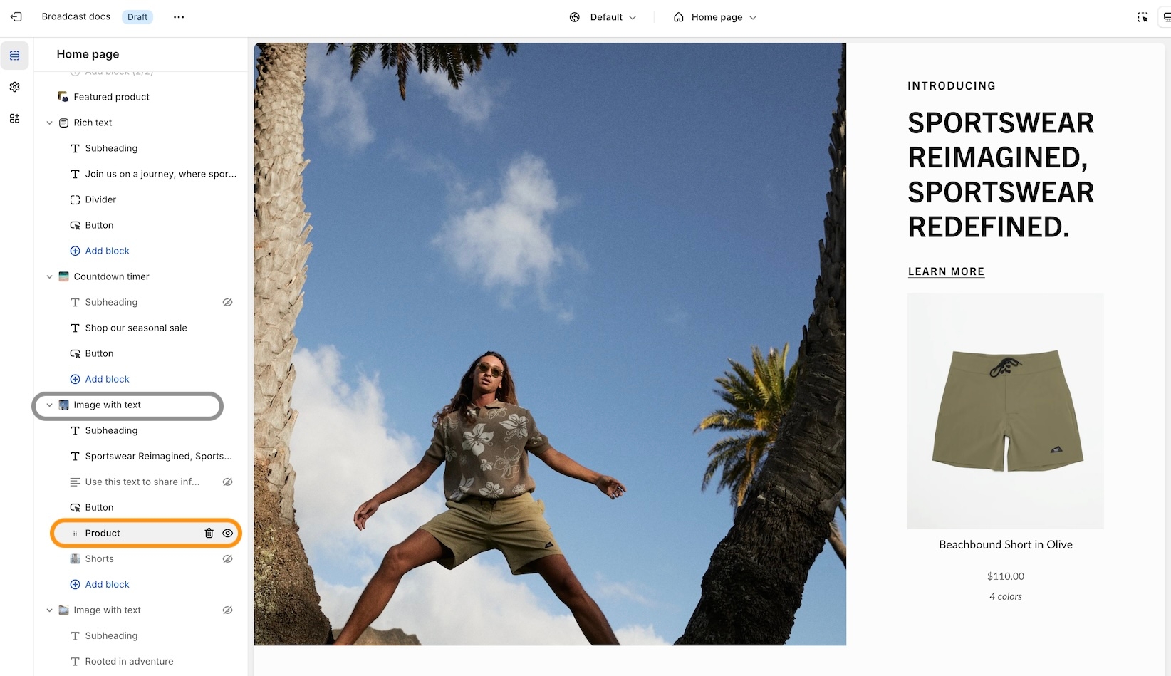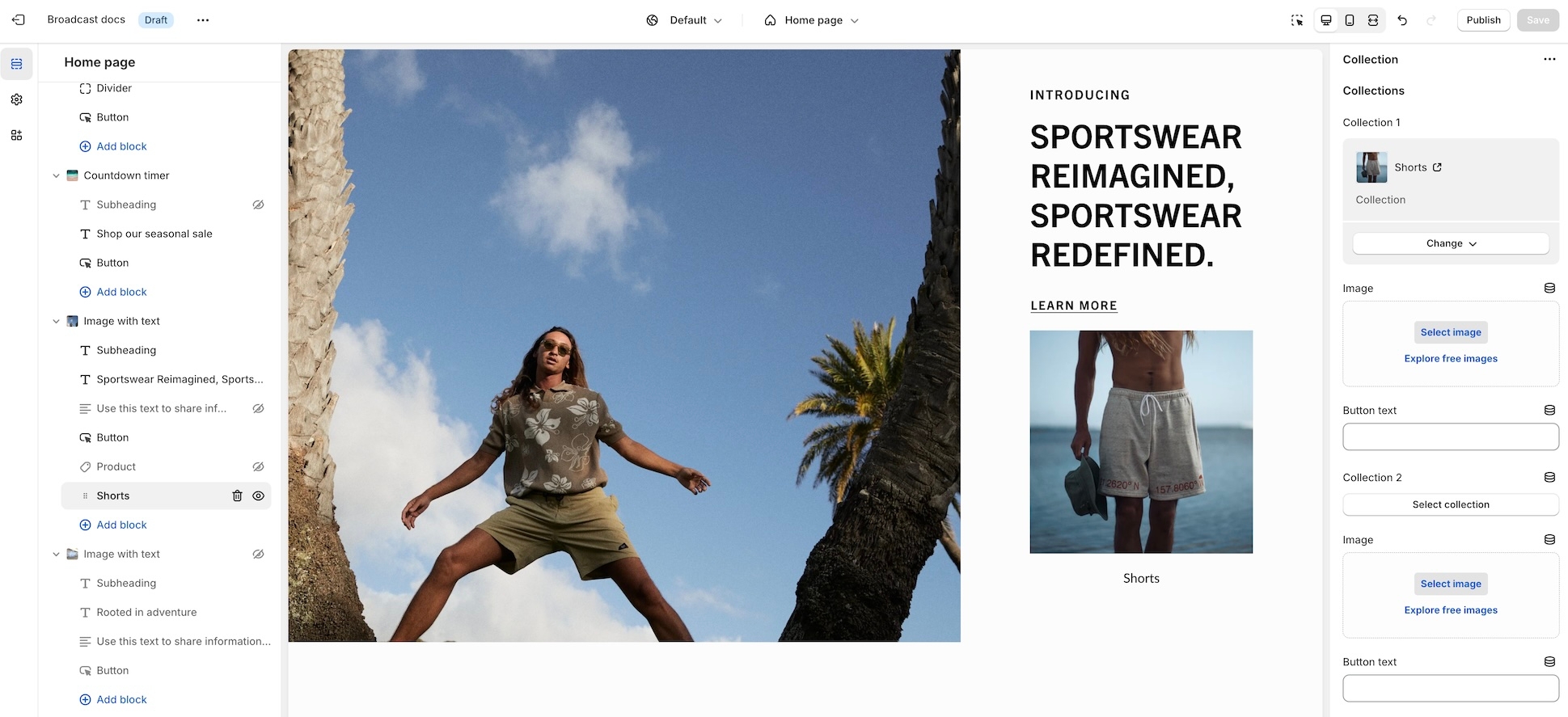 Easily display and link to products or collections with new blocks added to the Image with text section. These two new blocks can help you quickly build promotions on any page: