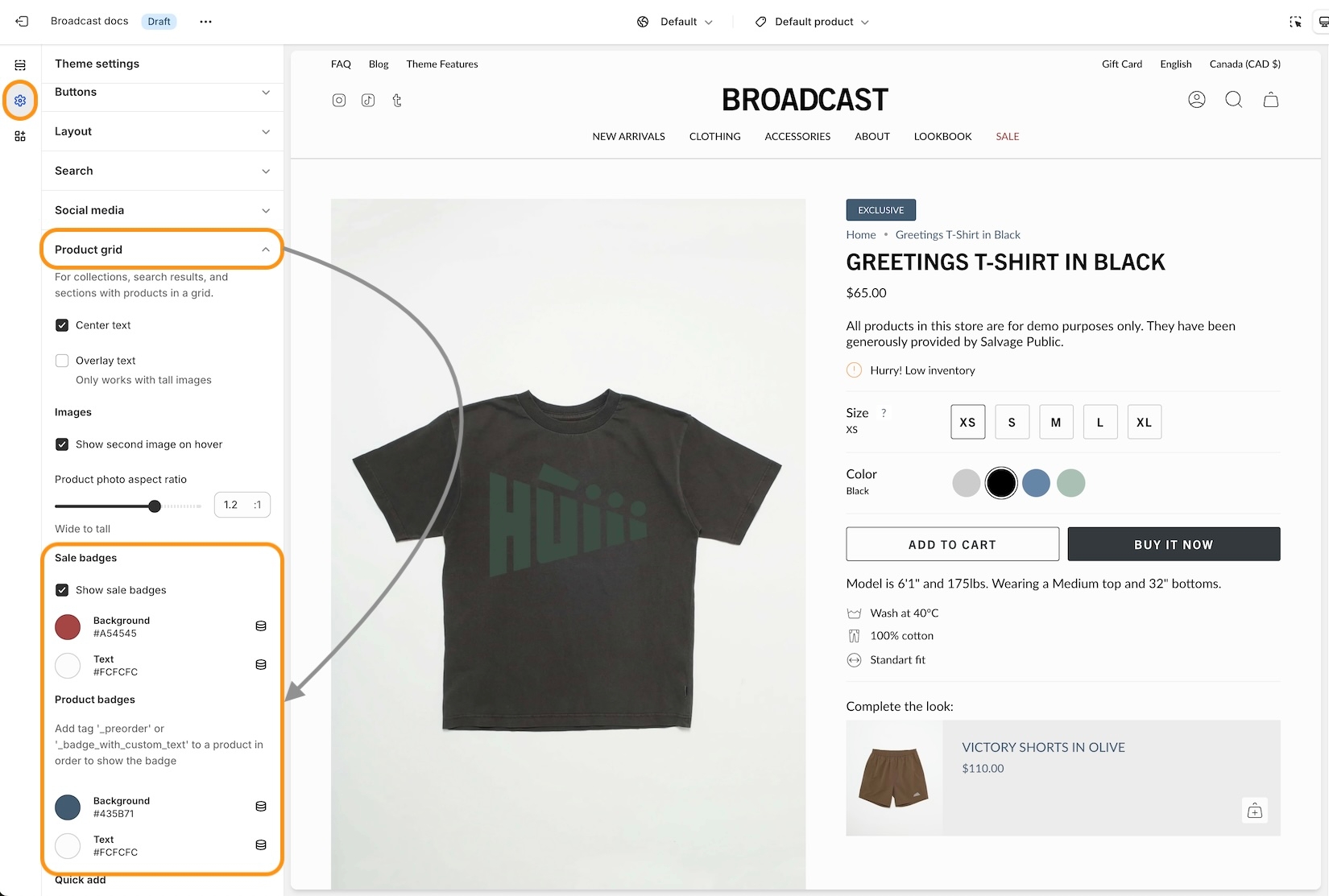Custom and Sale badges can be styled in the 'Theme Settings' tab under 'Product grid'. These settings are applied to badges placed on both the Product card (also known as Collections or Product Card) and now the Product form when using the Badges block: