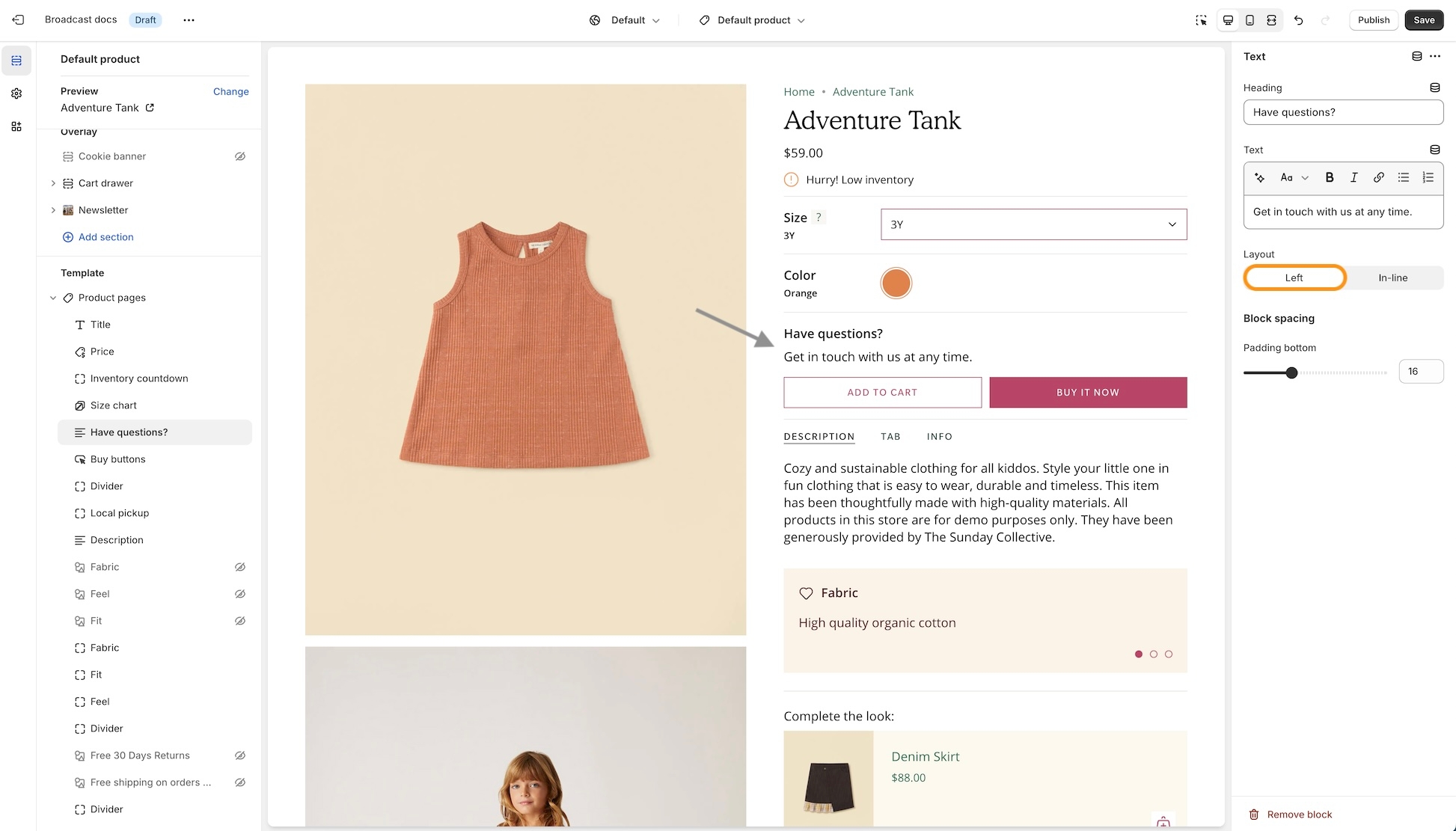 You can now have the text block styled to match the variant options when using the modern Product form layout. This places the heading to the left and the text in the next column that matches the style of the variants:
