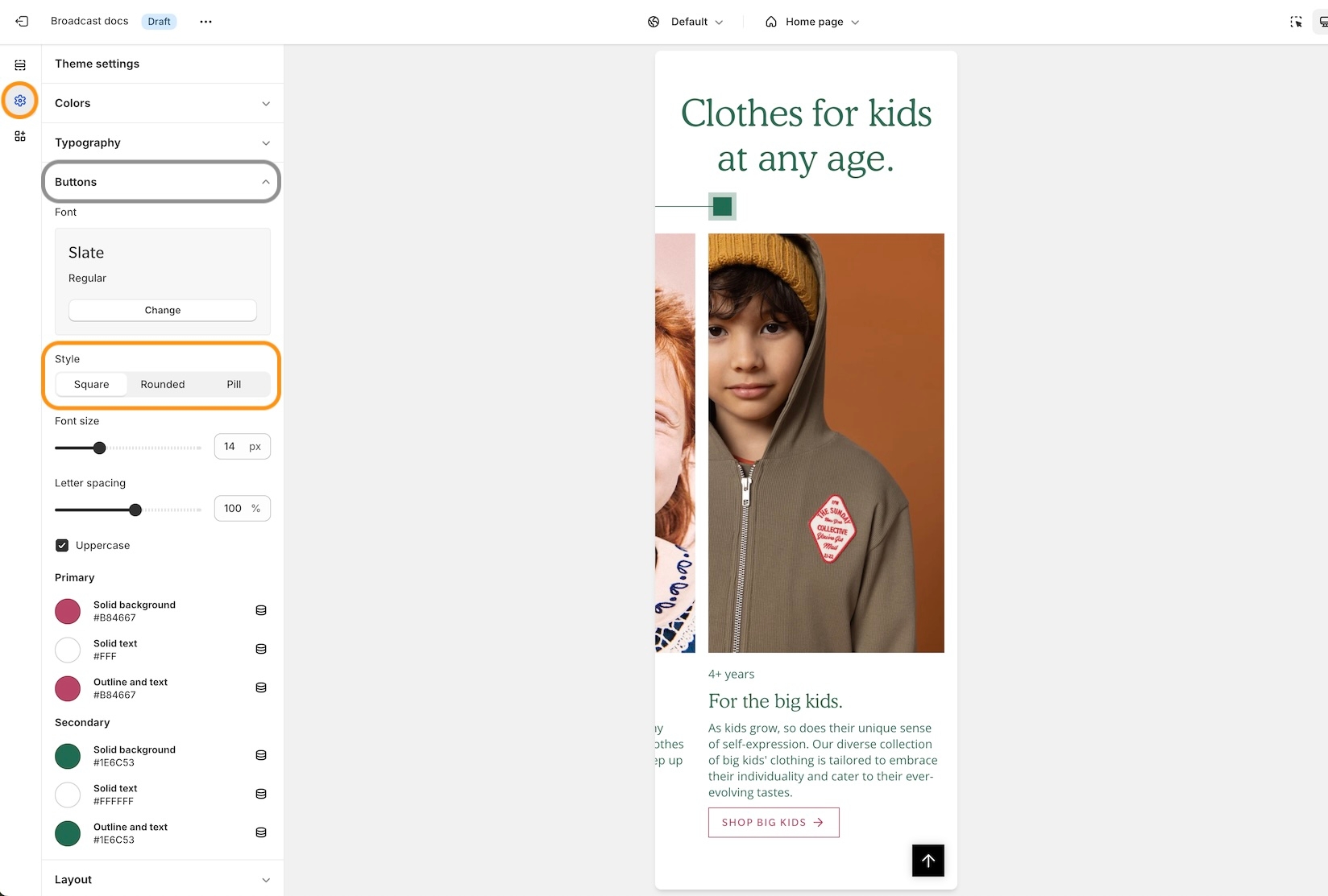 For square, rounded, or pill-styled period moments, use the options under Theme Settings -> Buttons: