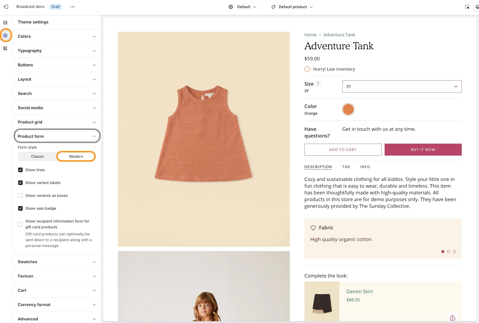To enable this option, ensure the Modern form style is chosen under the Theme Settings -> Product form: