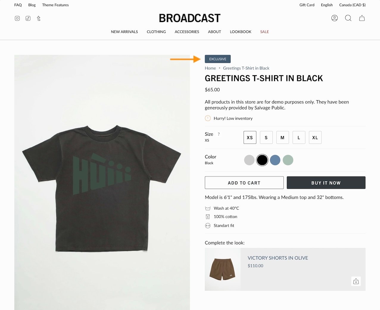 Badges can now be displayed on Broadcast Product pages. Broadcast can automatically display Sale badges or Custom badges that you create for individual products: