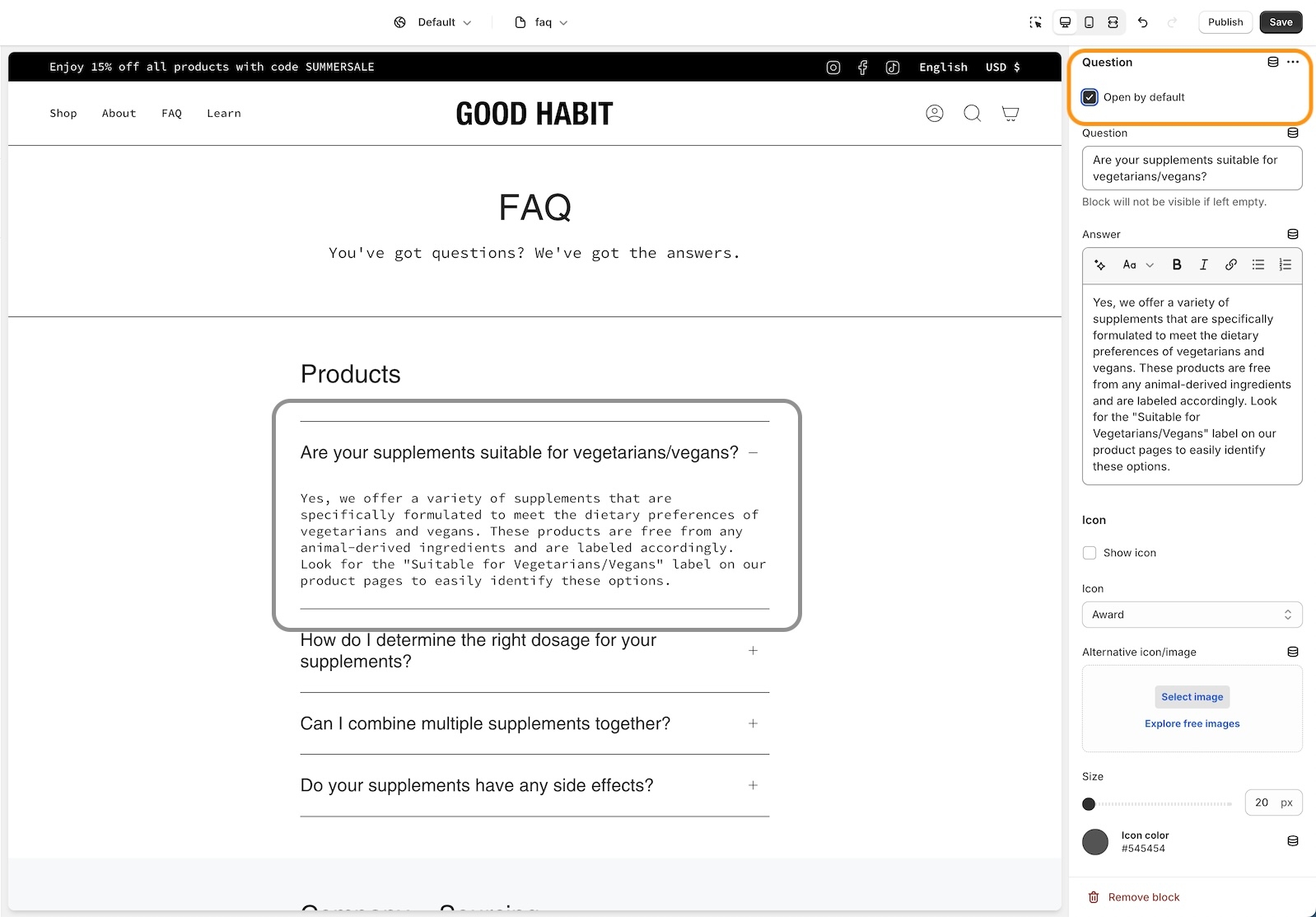 An open-by-default option has been added to keep certain accordion blocks open when the page is loaded: