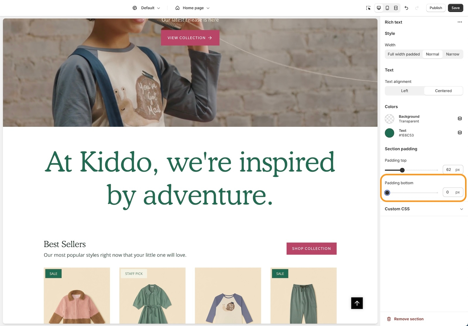 A bottom padding slider has been added to the Rich text and Image with text sections to help you manage spacing between sections: