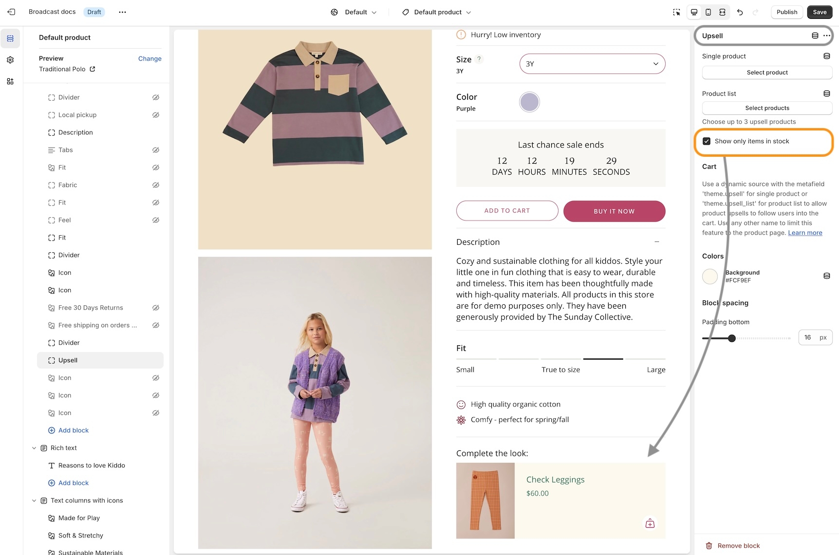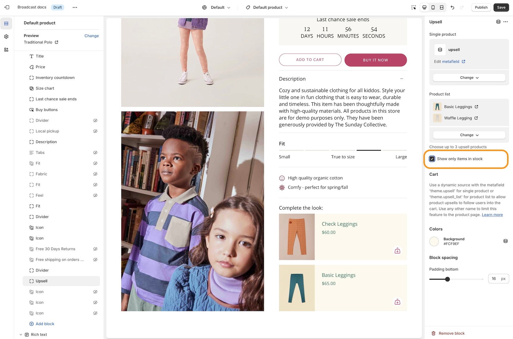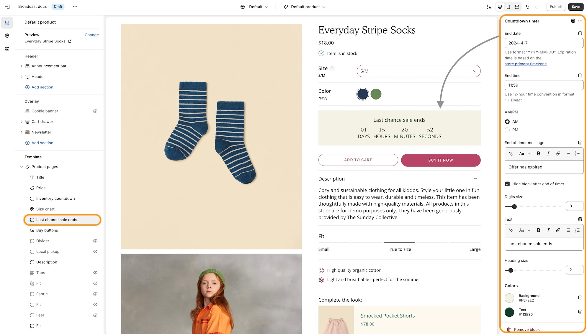 Add the countdown timer block and customize it with a wide-range of options. Use dynamic data sources to apply individual settings for any product: