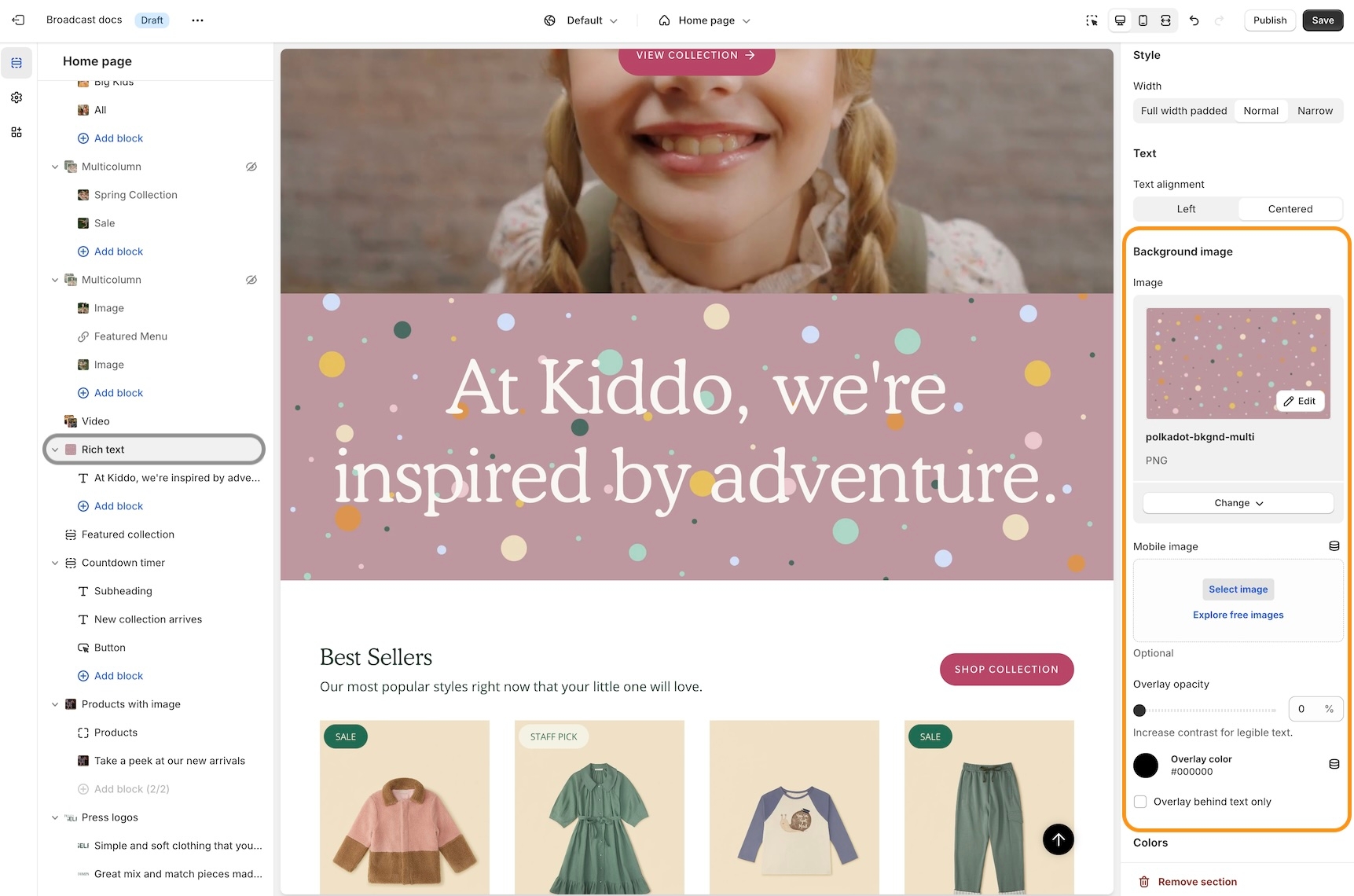 Dress up the 'Rich text' section with an option to display a background image with overlay options to help display the text over the image: