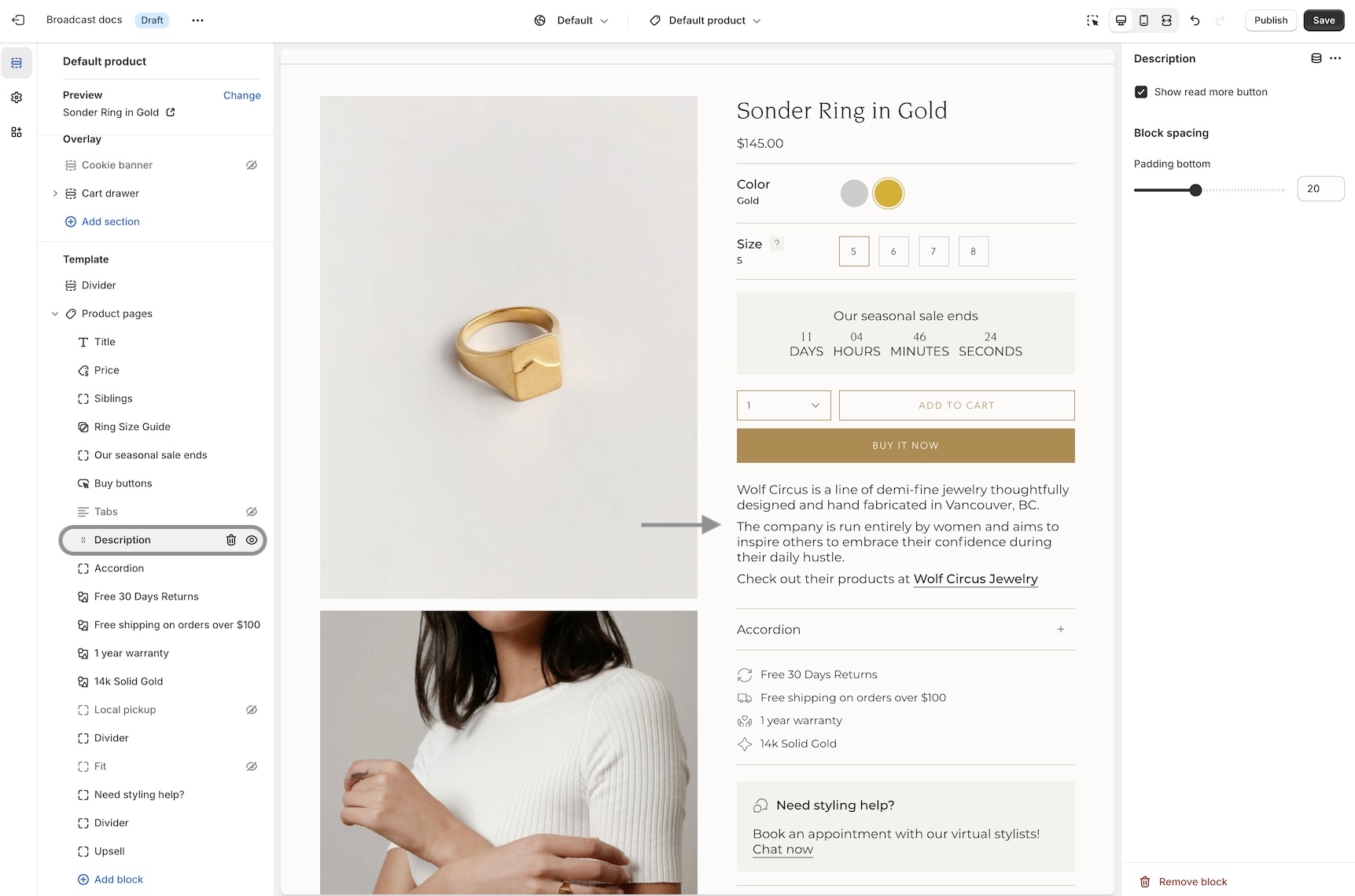 The Description block can be used to pull out the product description from an accordion or tab, and shown independently: