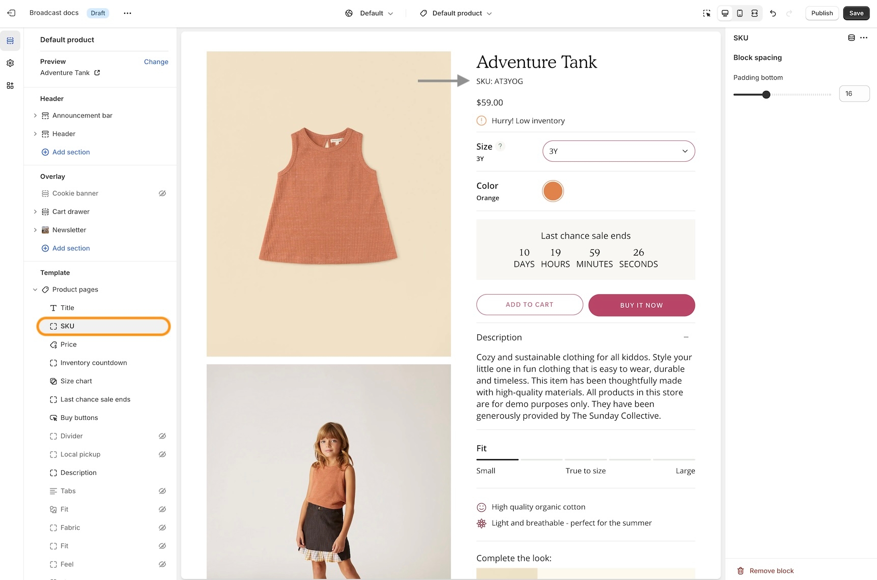Add and position the SKU block to display the value on your product pages. Adjust the padding with the block settings:
