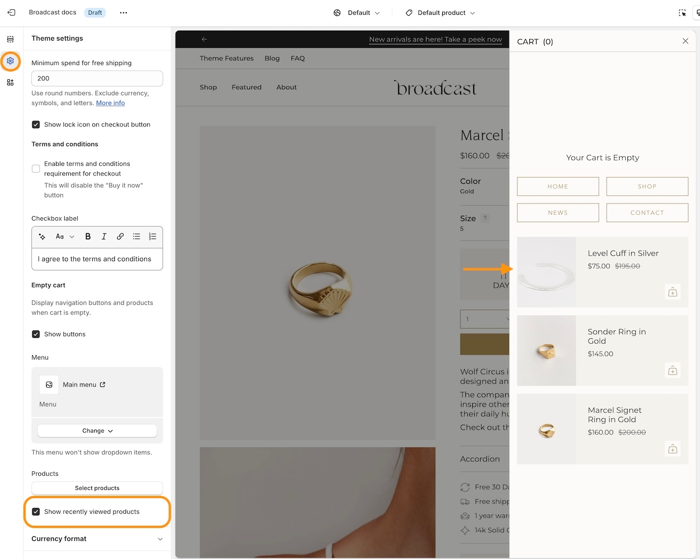You can now display recently viewed items in an empty cart. Broadcast includes a global theme setting under Theme settings -> Cart to toggle this feature: