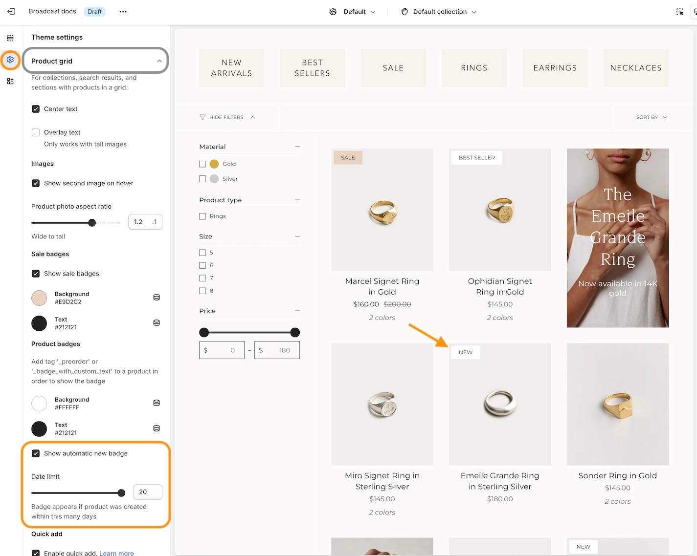 We've added an easy-to-use setting in the Theme Settings -> Product Grid to add and customize when the 'New' badge appears on collection pages and the product grid: