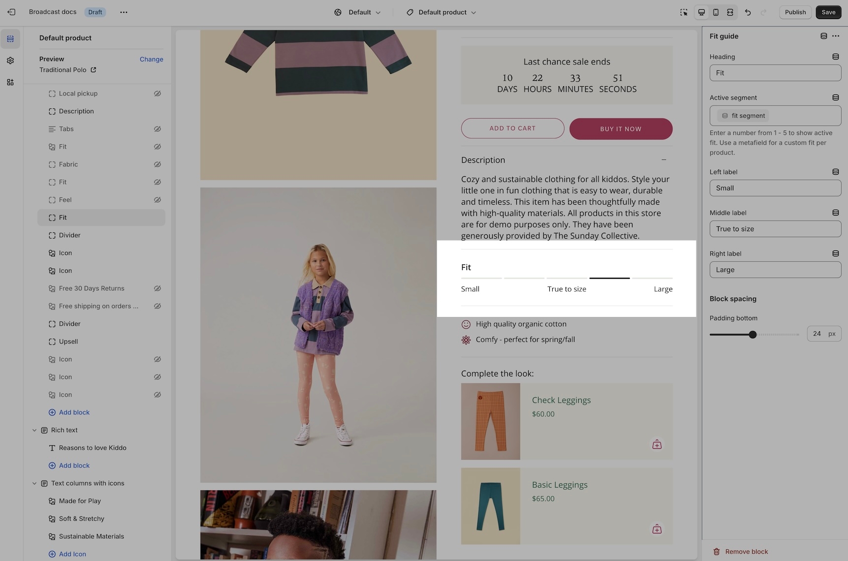 Broadcast includes an easy-to-use fit guide block for Product pages. Help customers visually see how items fit. Each product can have a custom value for the line chart: