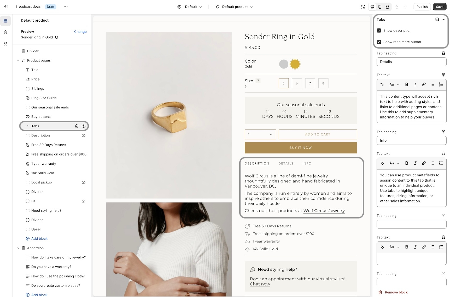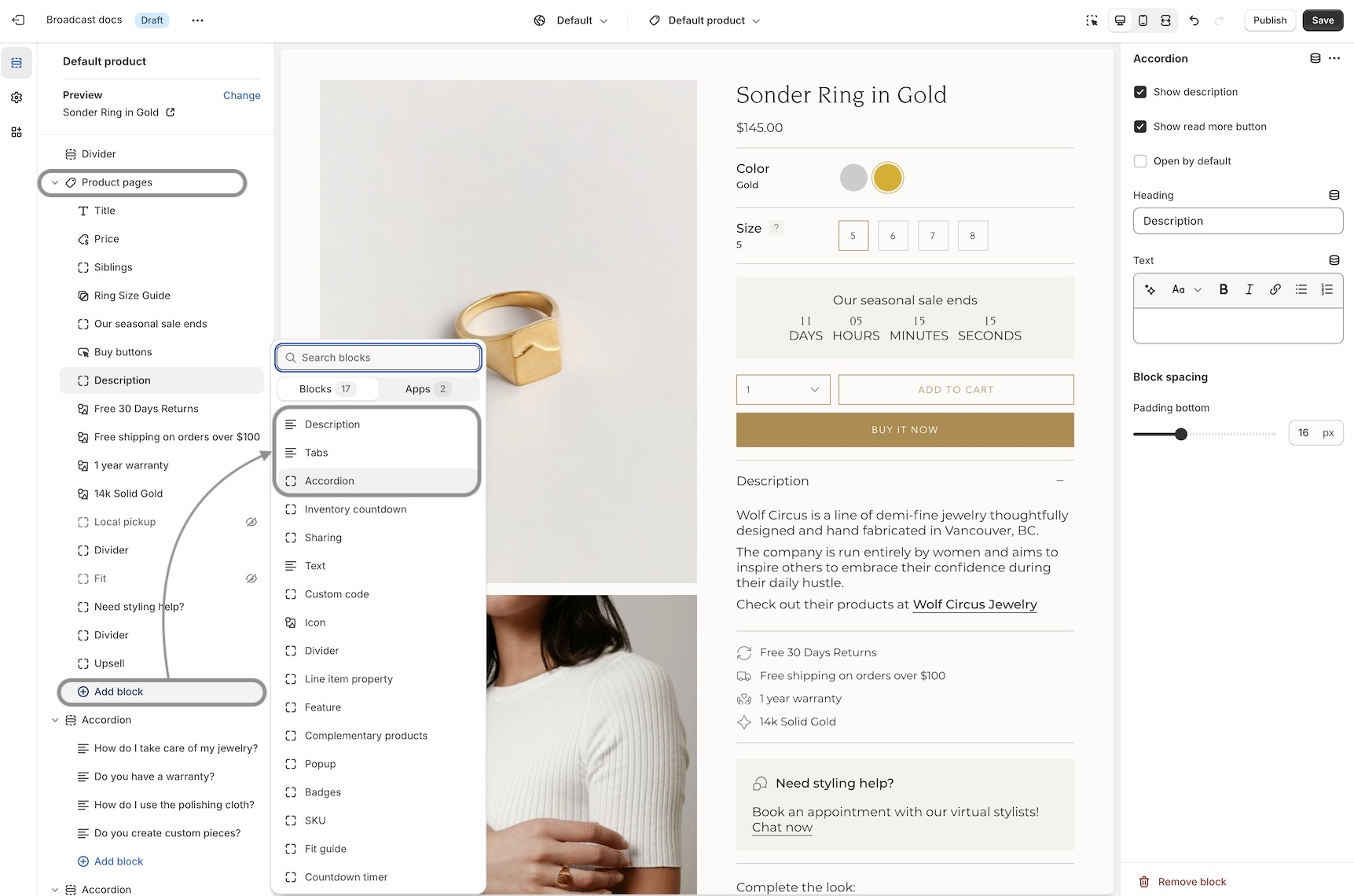 We've separated out the accordion, tabs and description into individual blocks. Now with greater customization and flexibility.