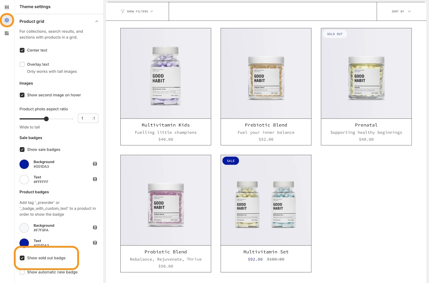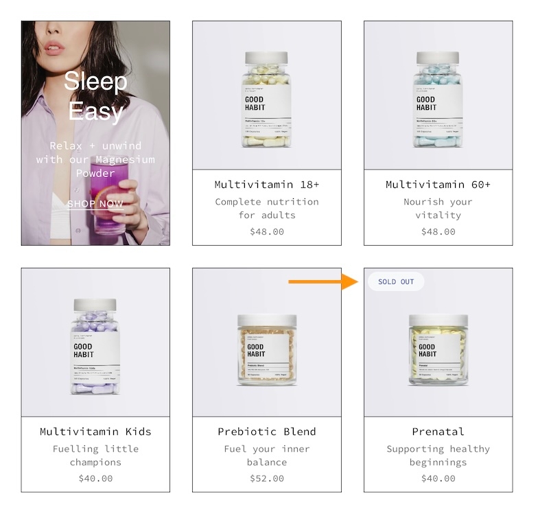 Items that are sold out can now display a badge on the product grid or collection listings. The price is now also shown with the product information: