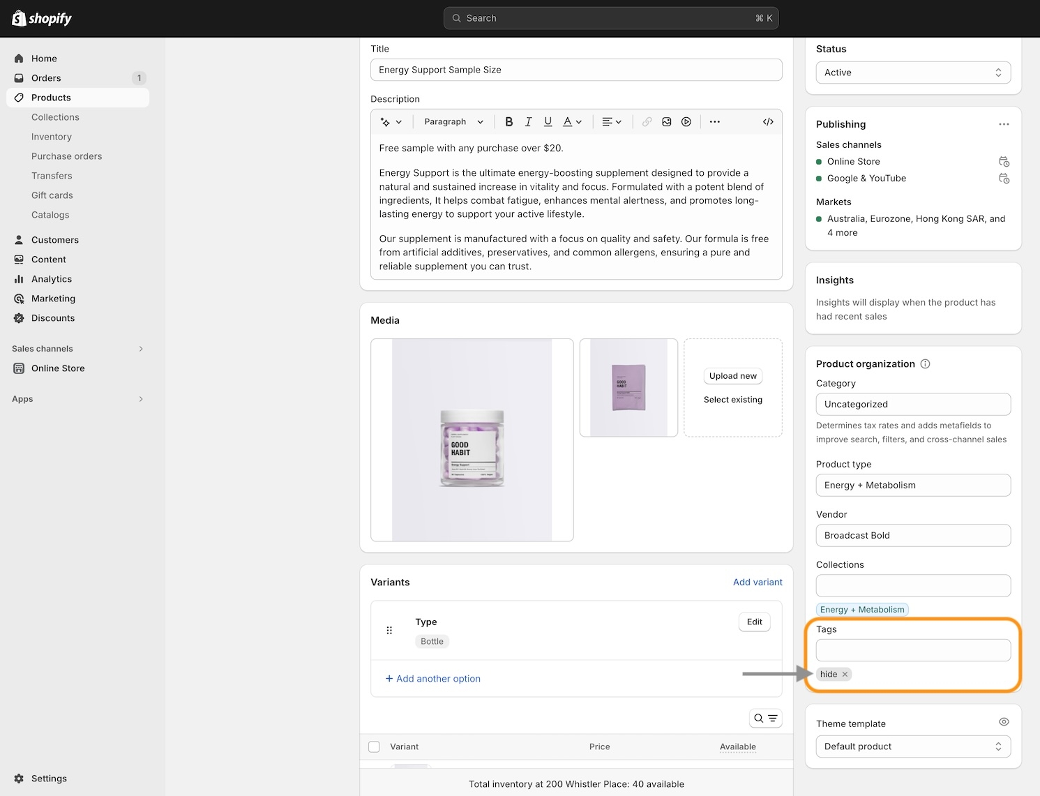 tag, the product won't appear on collections and search results: