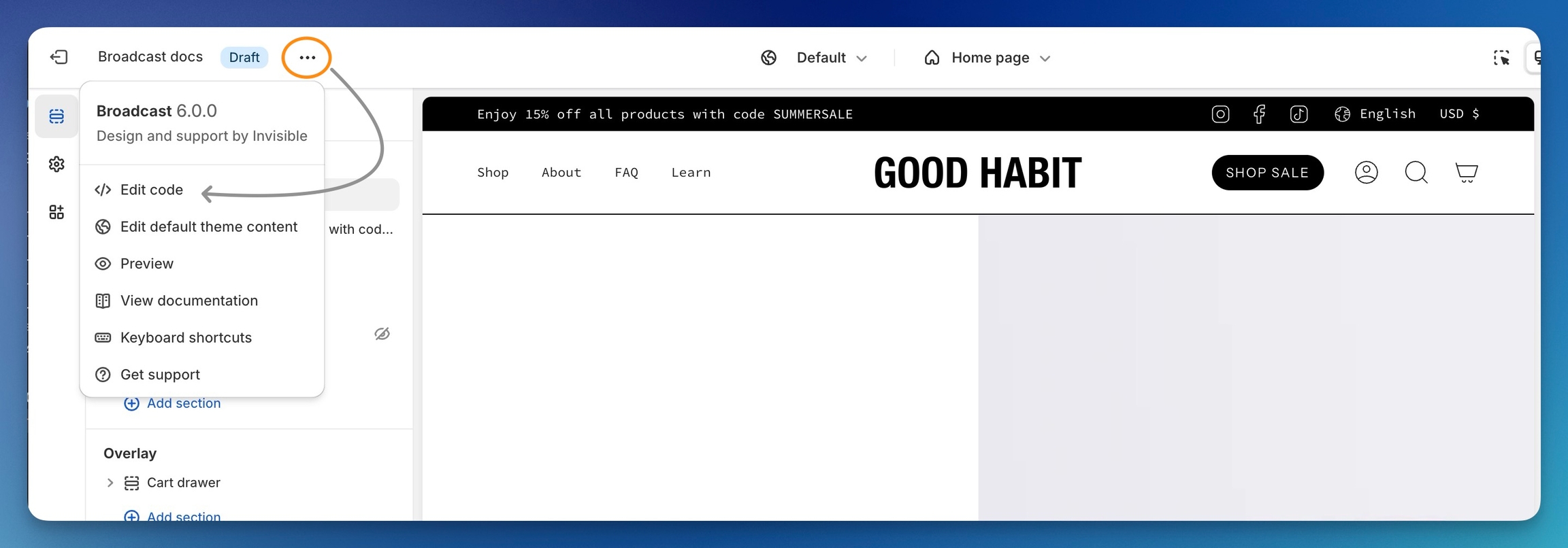 Click on the ellipses (three dots) icon at the top of the Theme Editor to view theme actions, and choose Edit code: