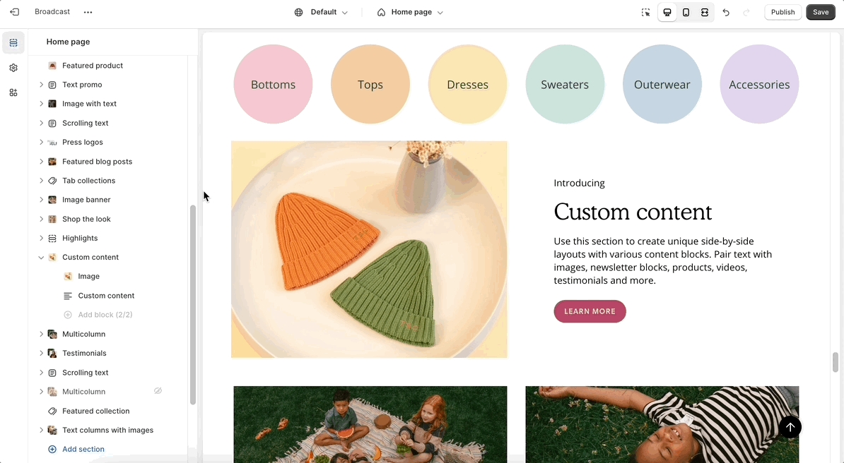 Build rich and creative sections on your homepage, product pages, collections, blogs, pages, and more by exploring different sections and block types.
