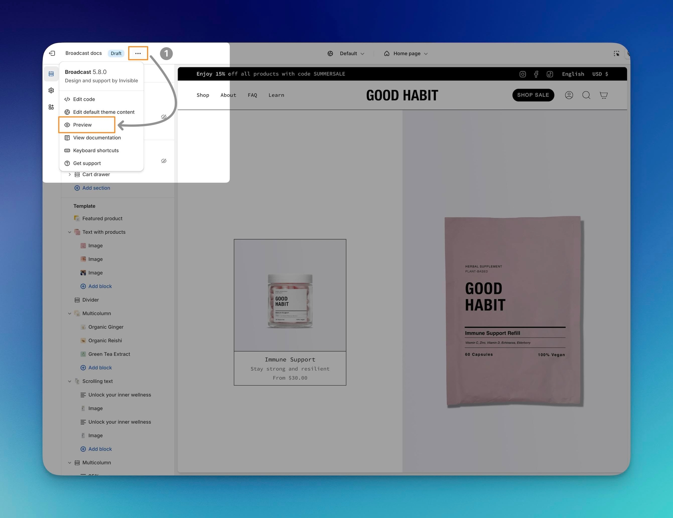 Start with your draft theme in the Theme Customizer. Click on the ellipses icon (three dots) at the top next to the theme name and choose Preview: