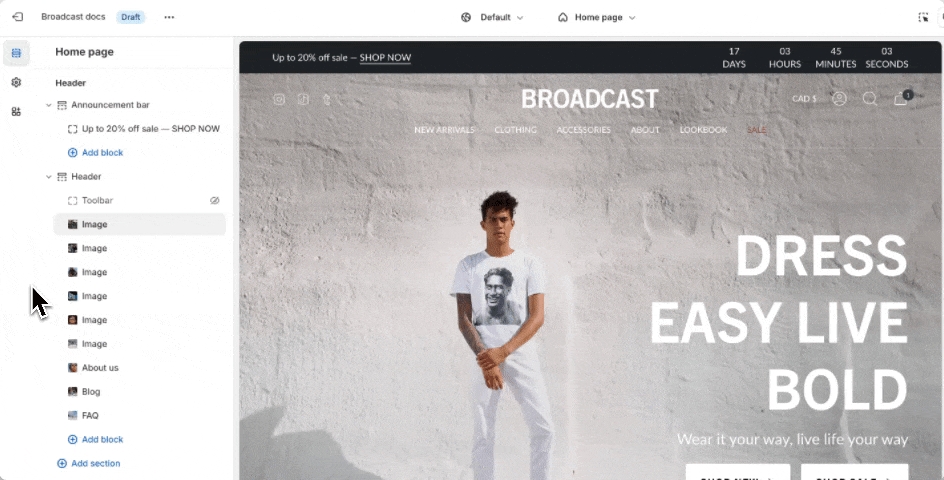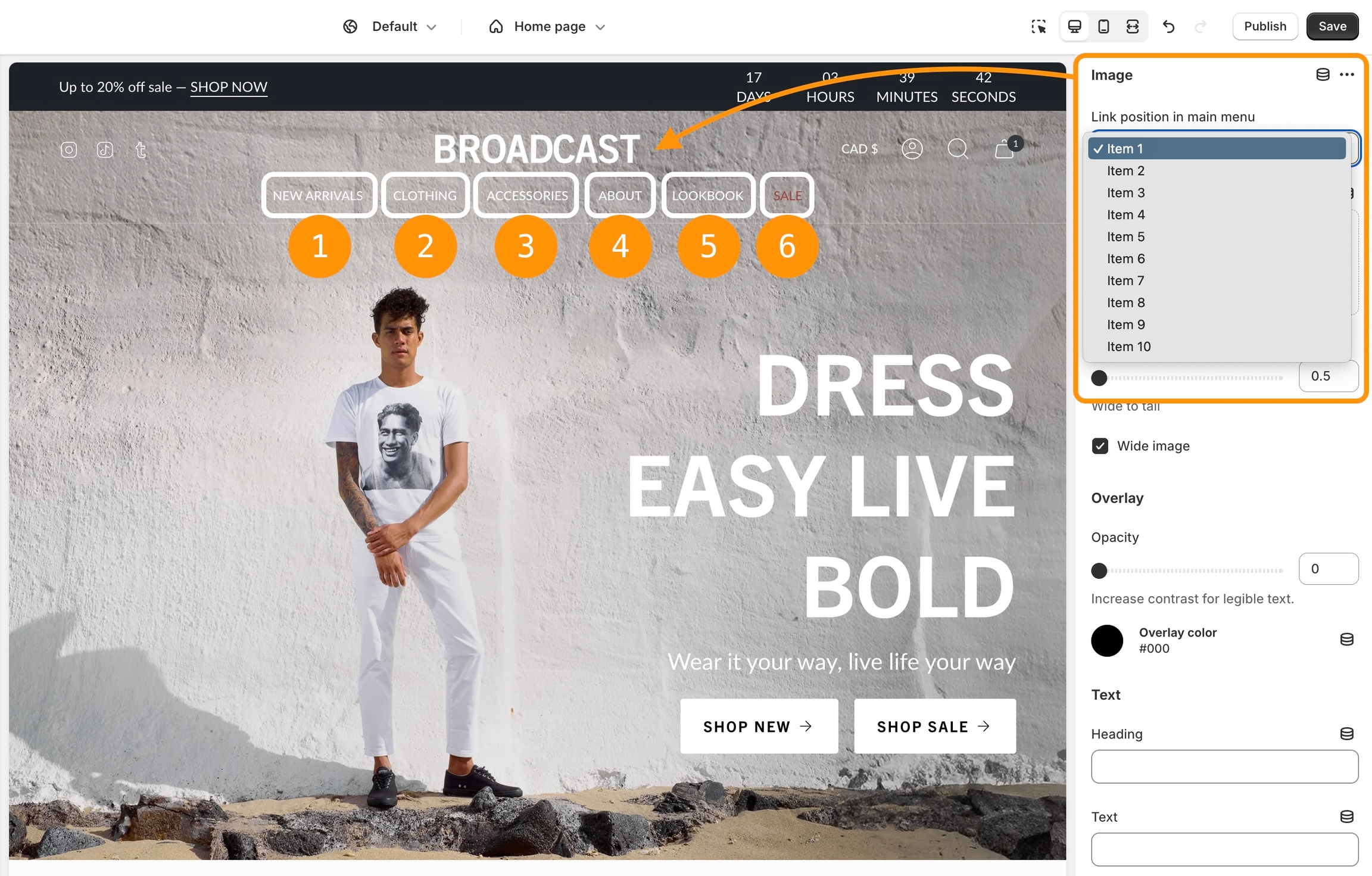 Next, map the image to a menu position. If you'd like your image to appear on the first menu item, choose "Item 1". In our example, the image block is mapped to "Item 1", which would be the "NEW ARRIVALS" menu: