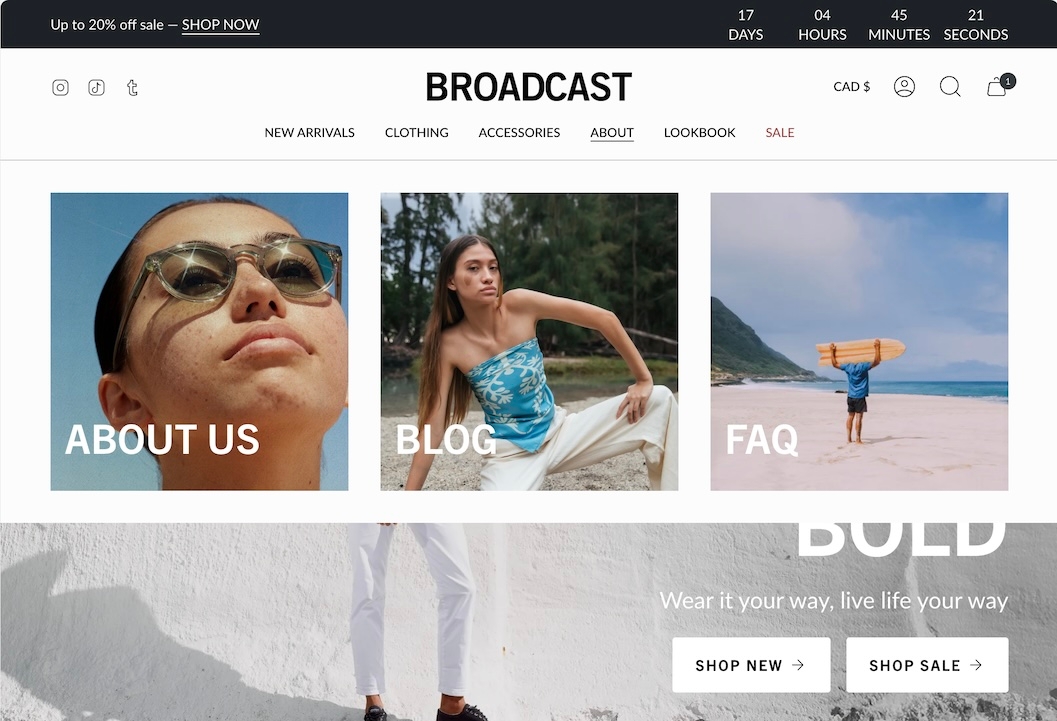 Broadcast can bring your navigation to life with images. Promote your product lines and sales events by easily adding image promotions to any of your top-level menu items: