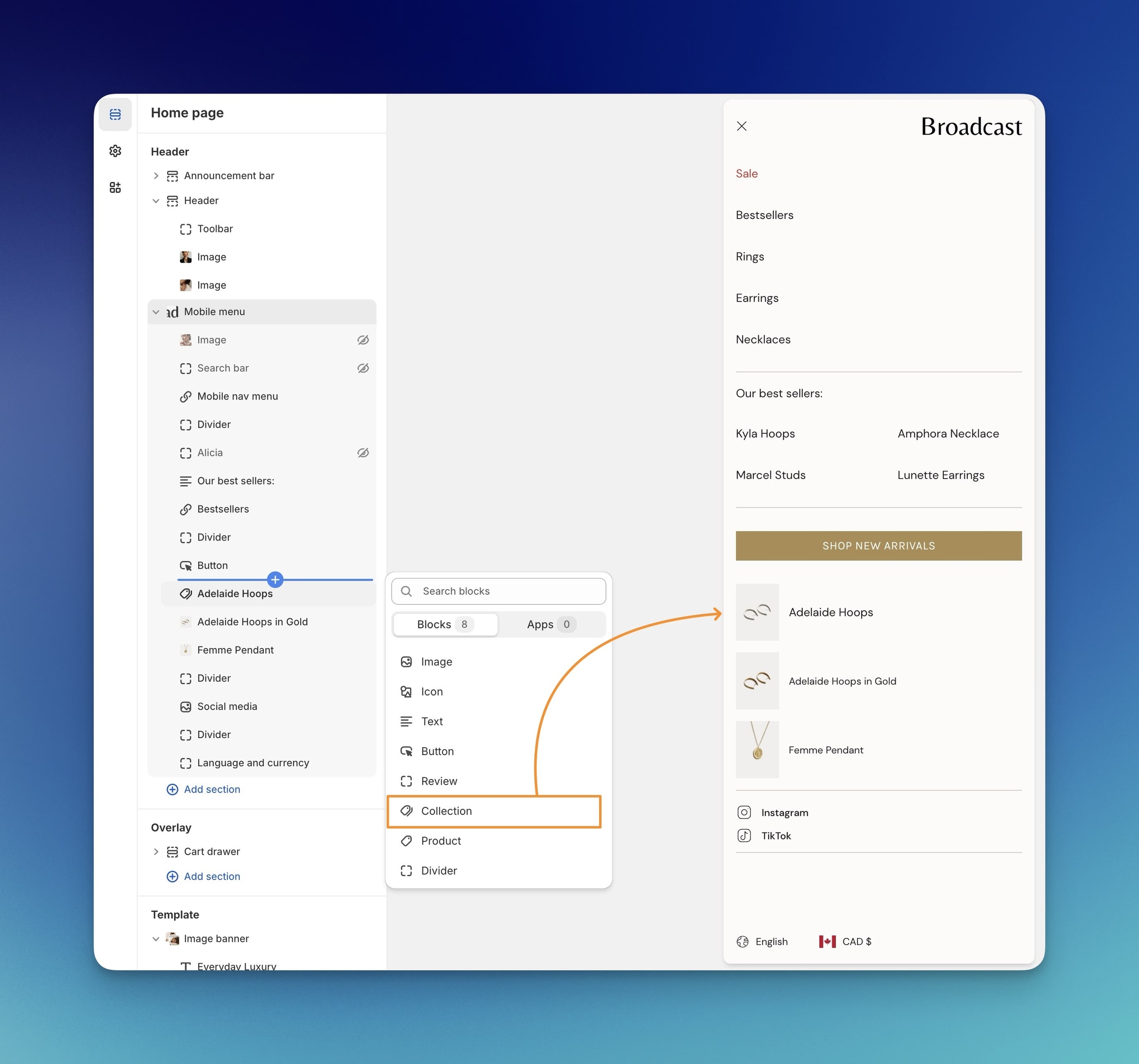 The Collection block links to a specific collection in your store. A custom image can be displayed to represent the collection, or the first product can be used as the default image.