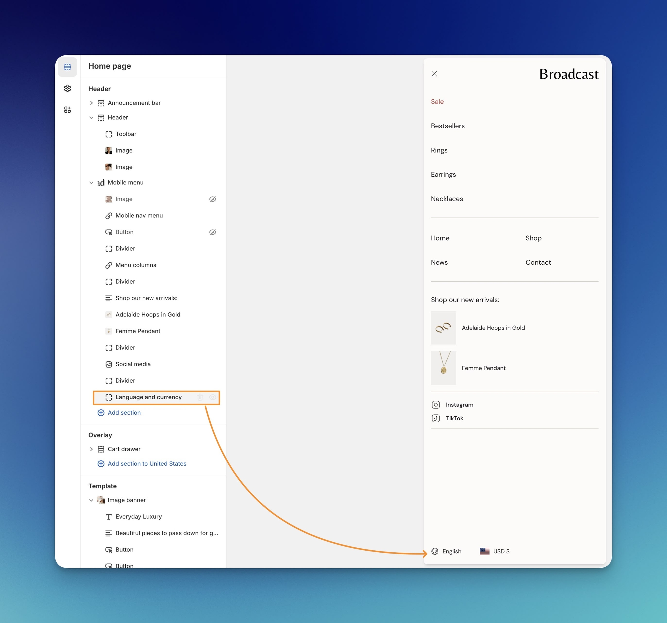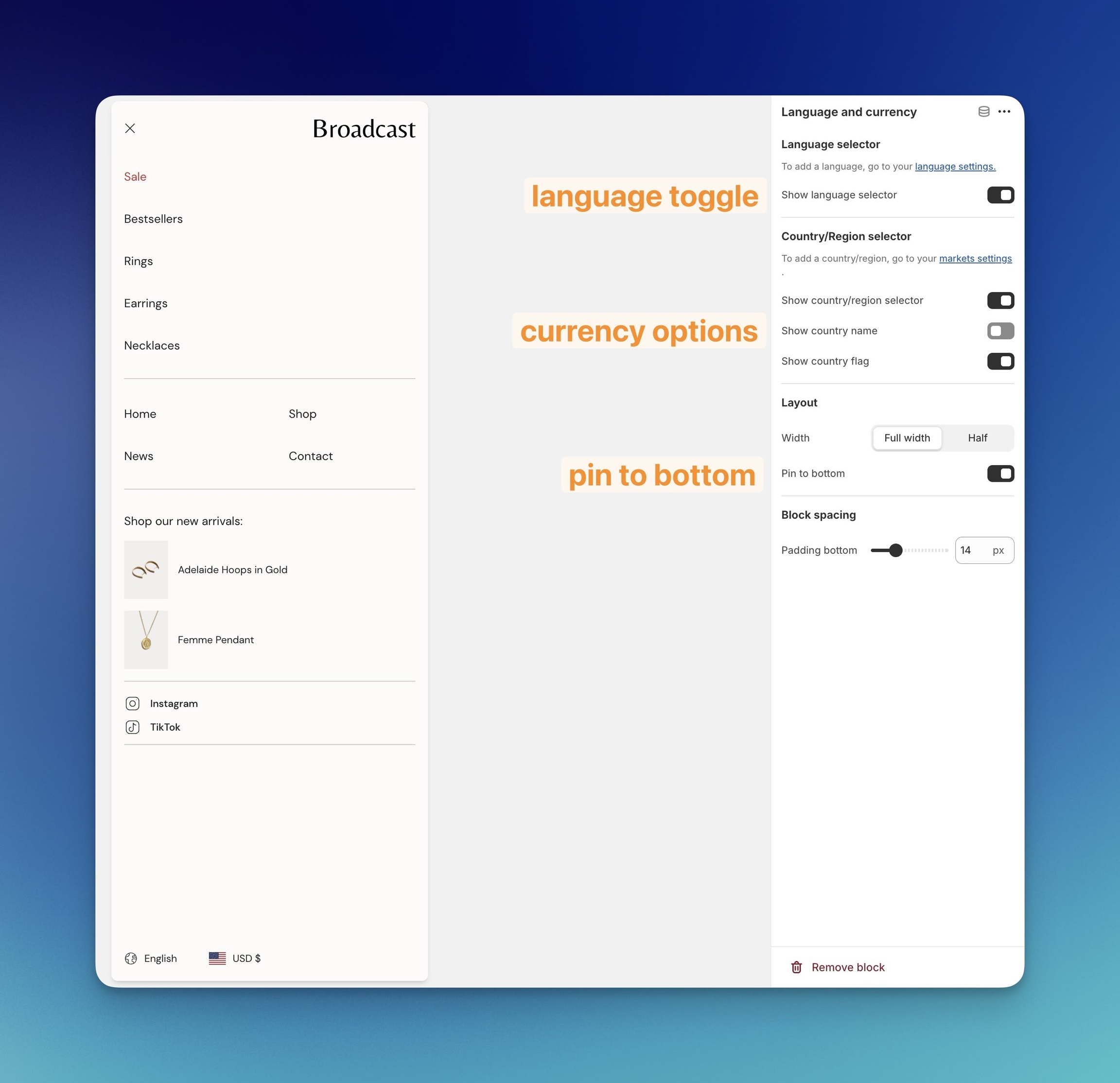Use the pin to the bottom and layout settings to adjust the position, width, and spacing: