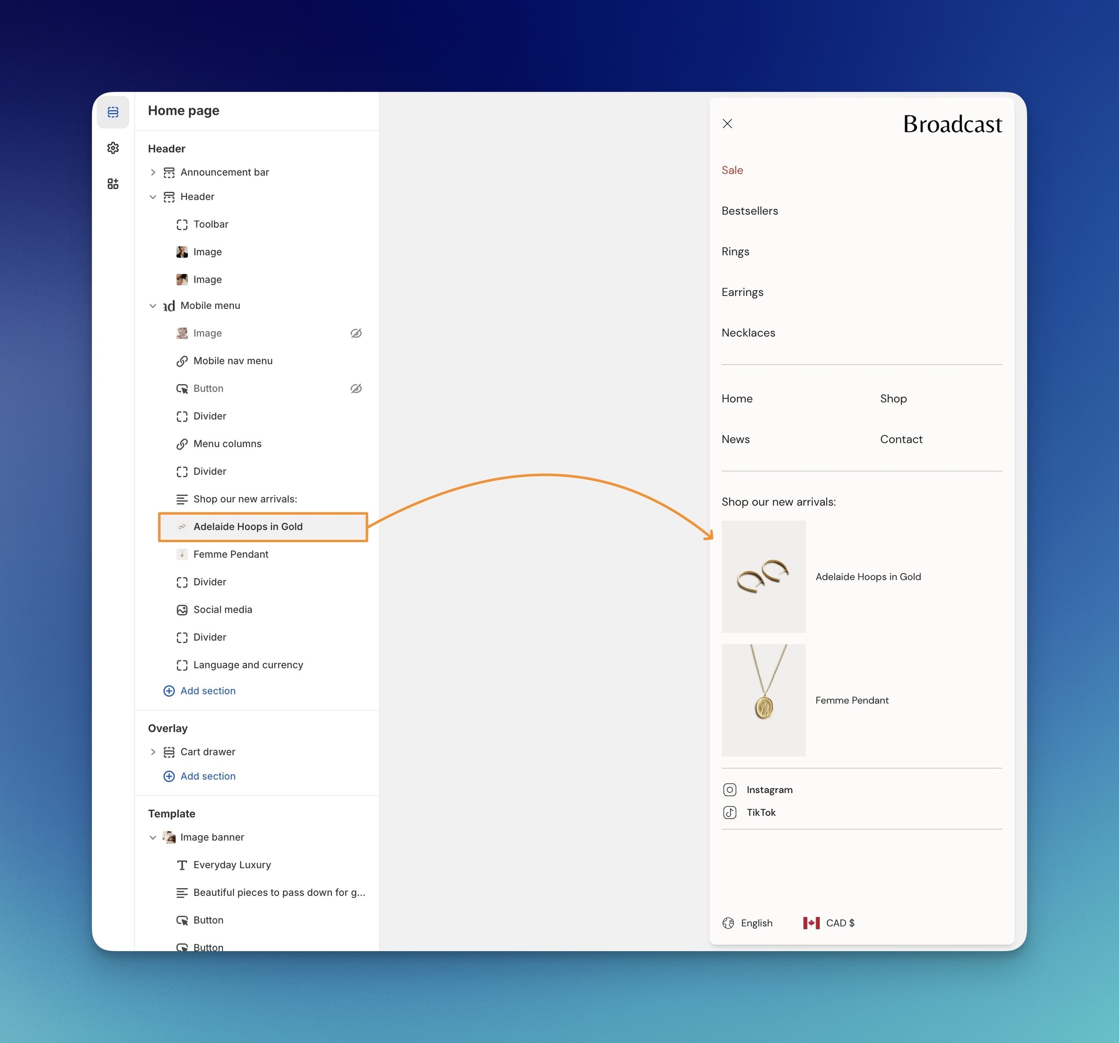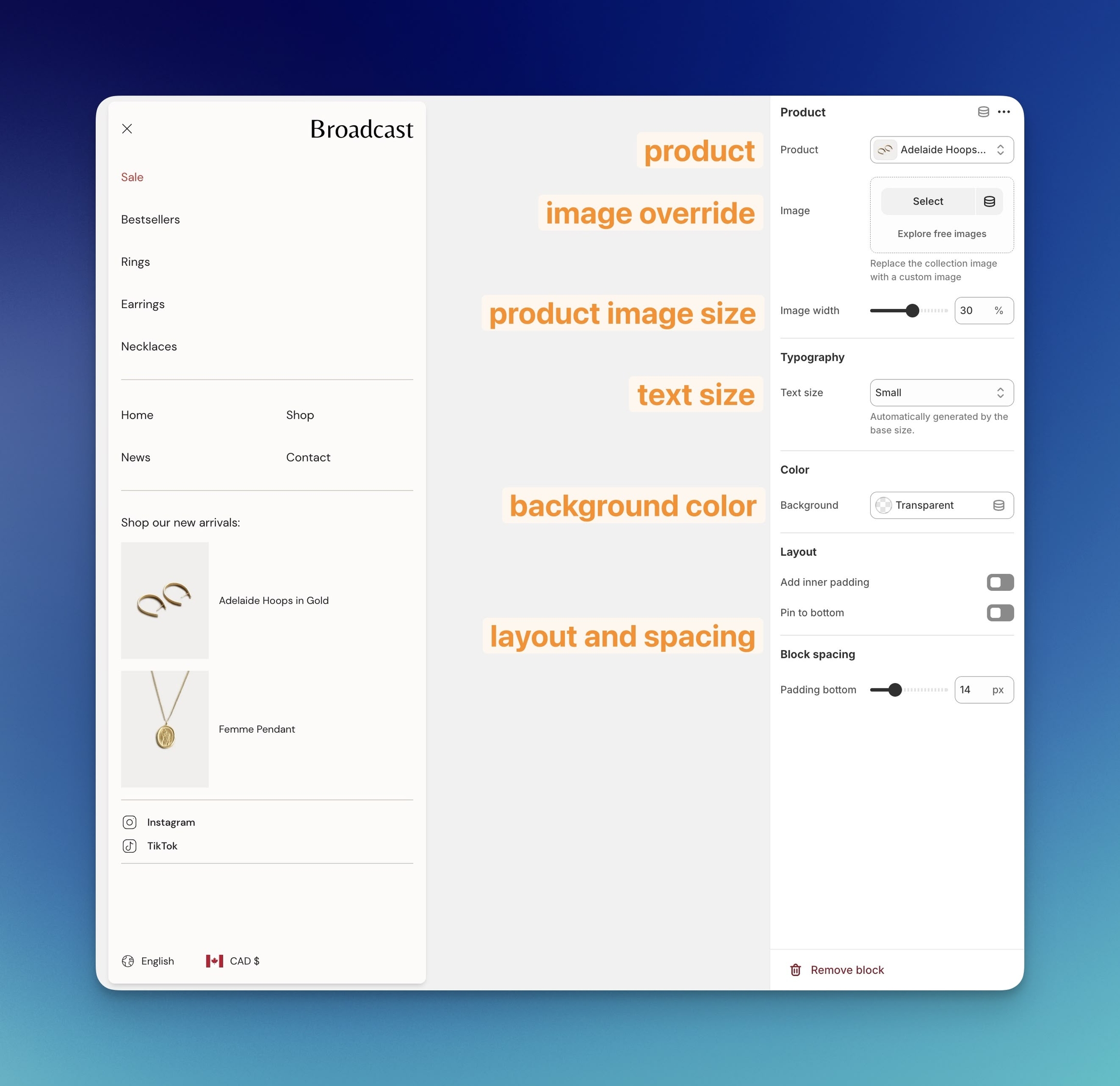 Use the block settings to choose a product, override the image, adjust the size and more: