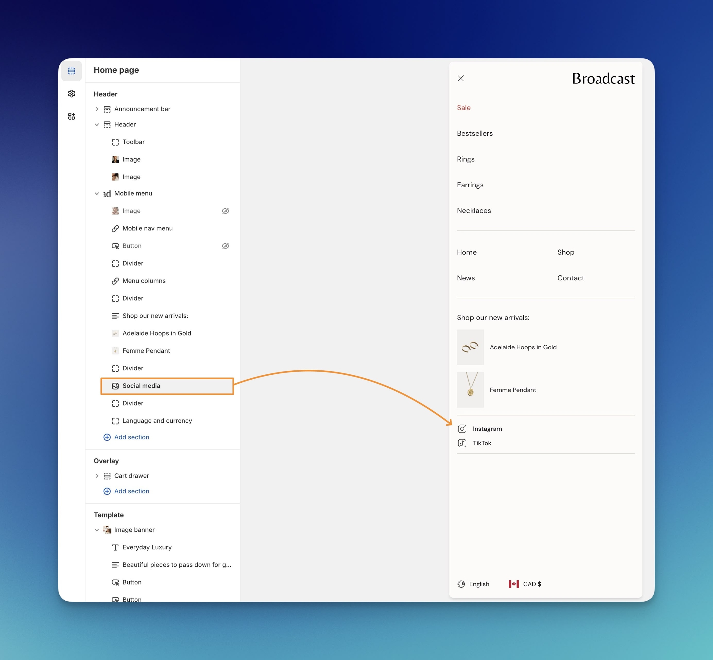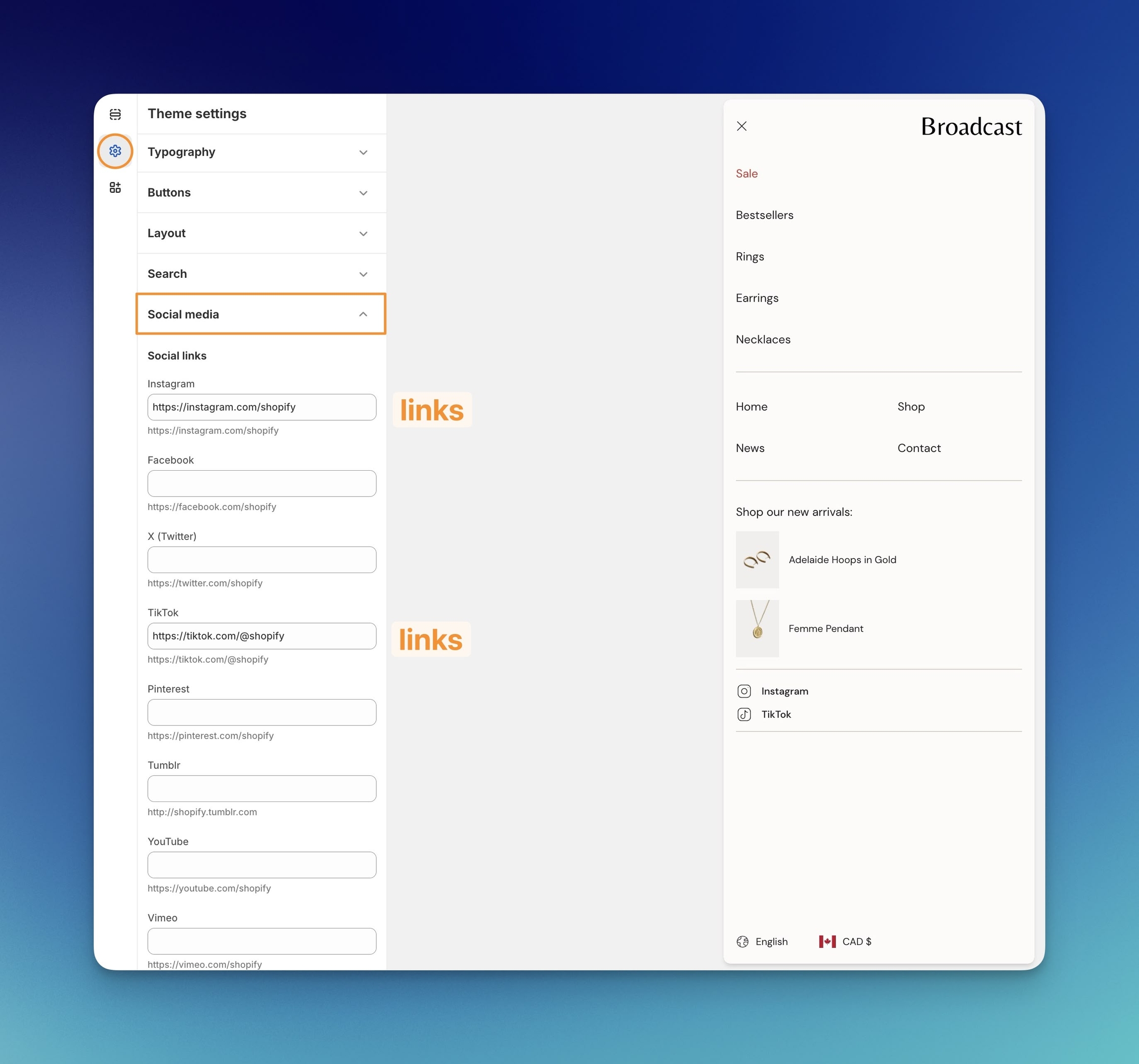 These links will appear based on your social media settings the Theme settings, under Social media. Only the links that have a URL configured will display: