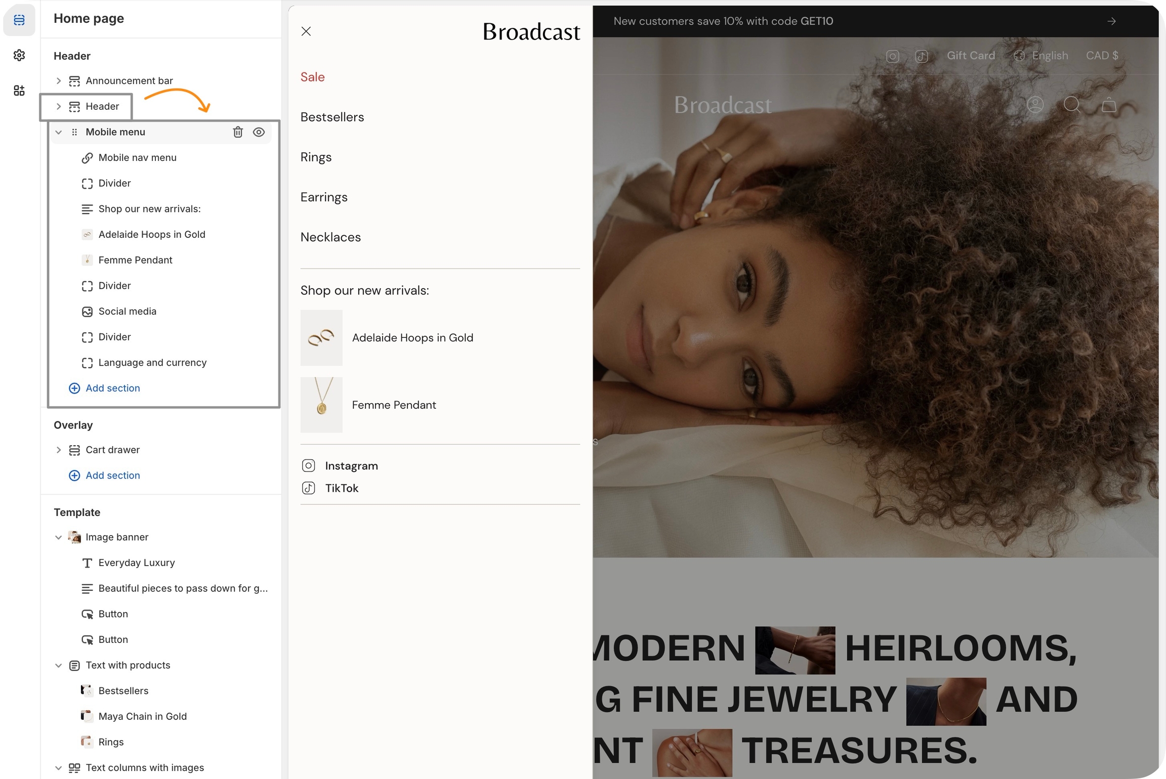 Add menu blocks to the mobile navigation in Broadcast. This feature helps you build a mobile menu with promotions, quick links, and language and social icons.
