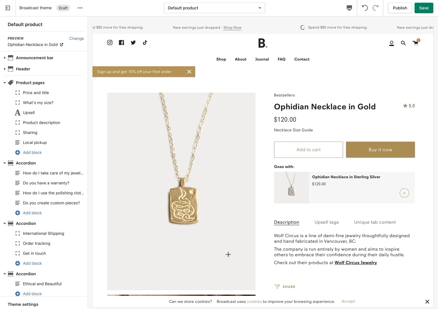 Broadcast includes a variety of settings to help you customize the layout and appearance of your product pages. The 'Product page' settings are global options for each product template, such as the 'Default product' template. These settings enable you to refine the appearance and behavior of your primary products.