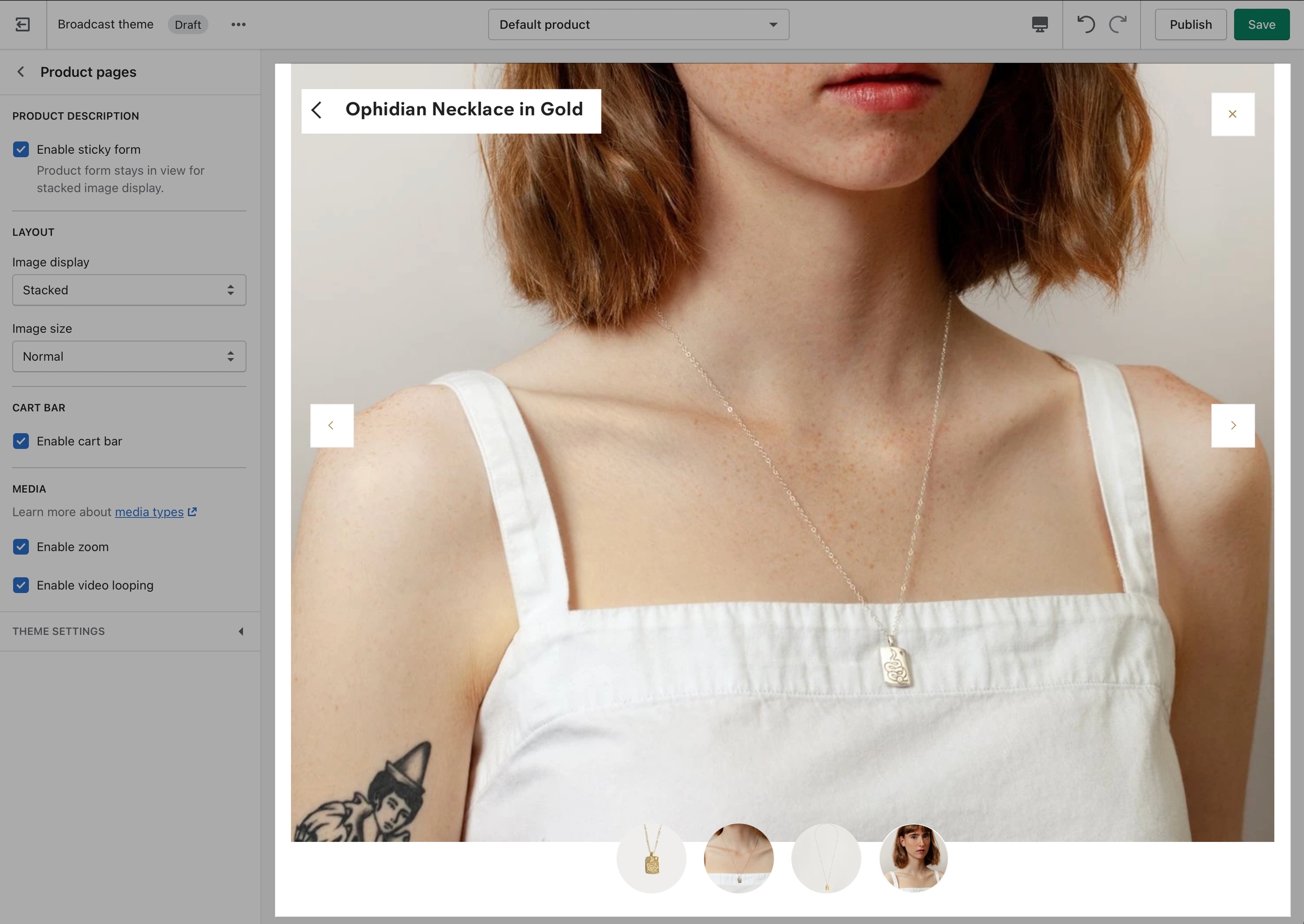 Broadcast includes a few different layout styles for displaying your product images and thumbnails:
