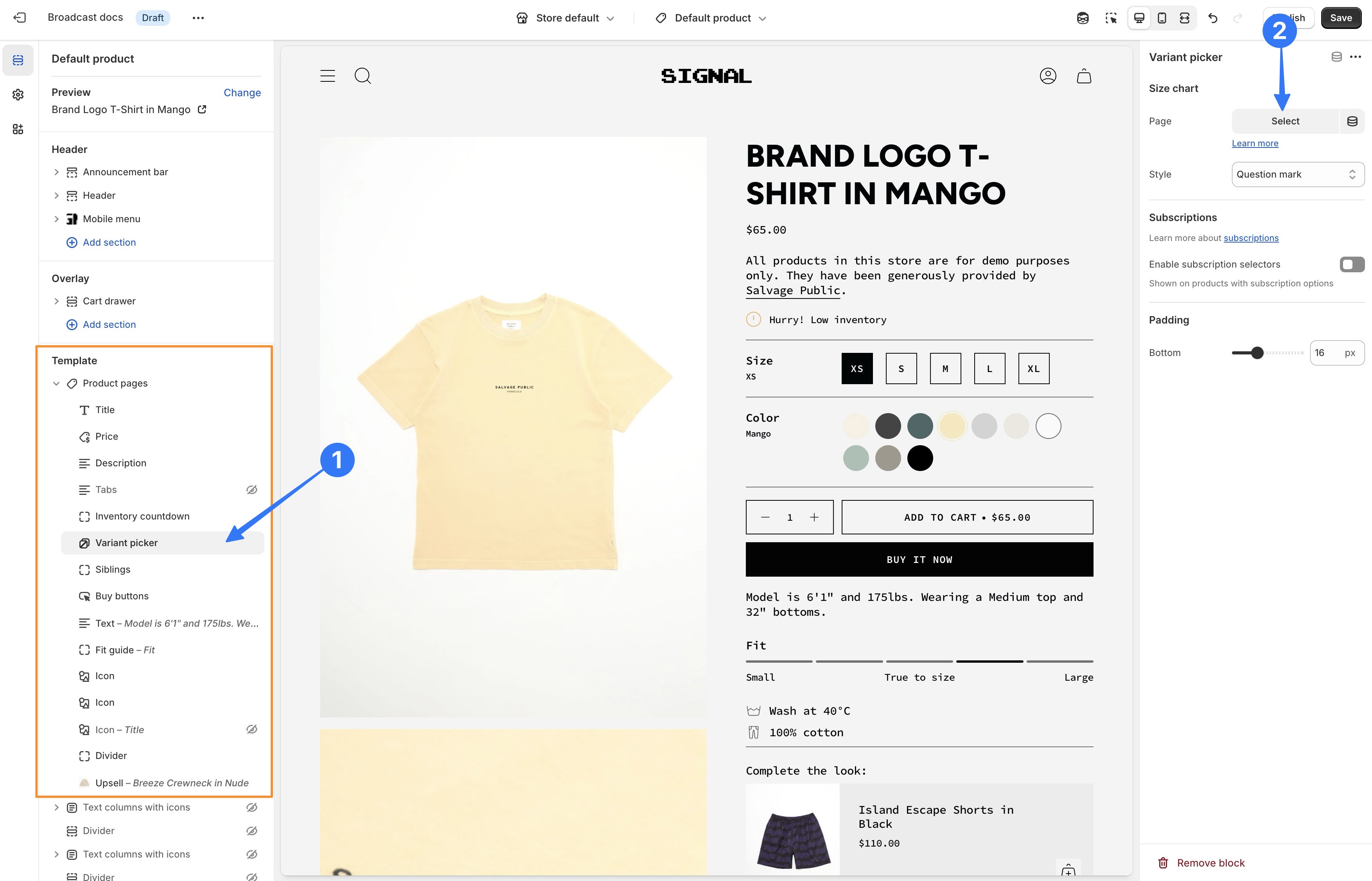 * On the left sidebar, under Template, expand "Product pages" and then choose "<mark style="background-color:yellow;">**Variant picker**</mark>"