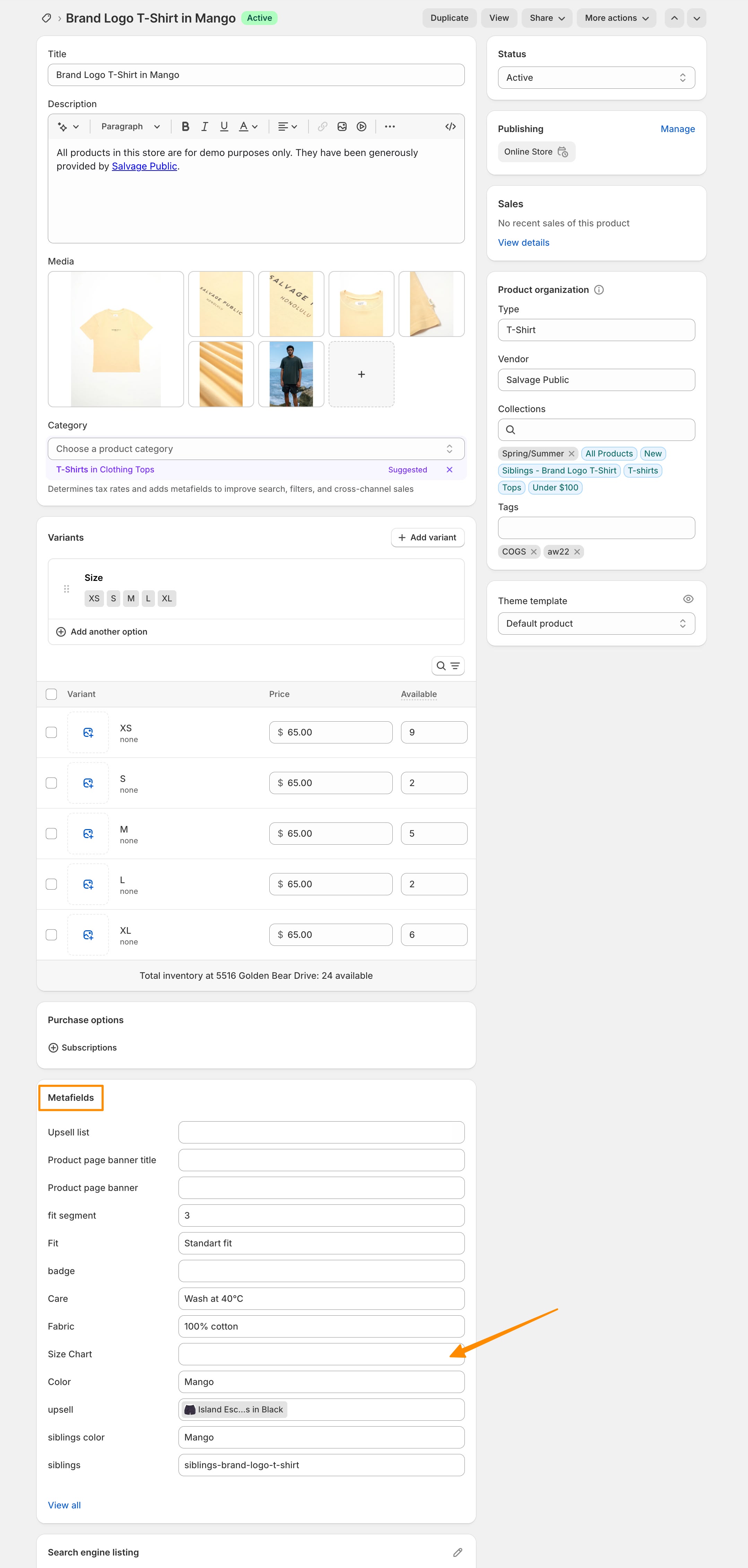 Your products will now have a Metafields section at the bottom. Use this to select which size chart page should be displayed when a customer is viewing this product.&#x20;