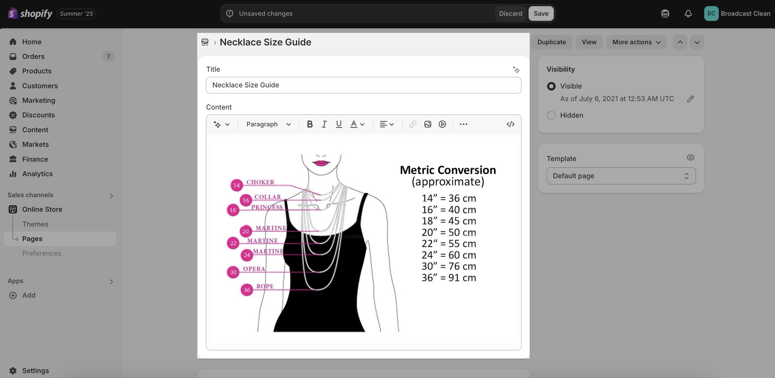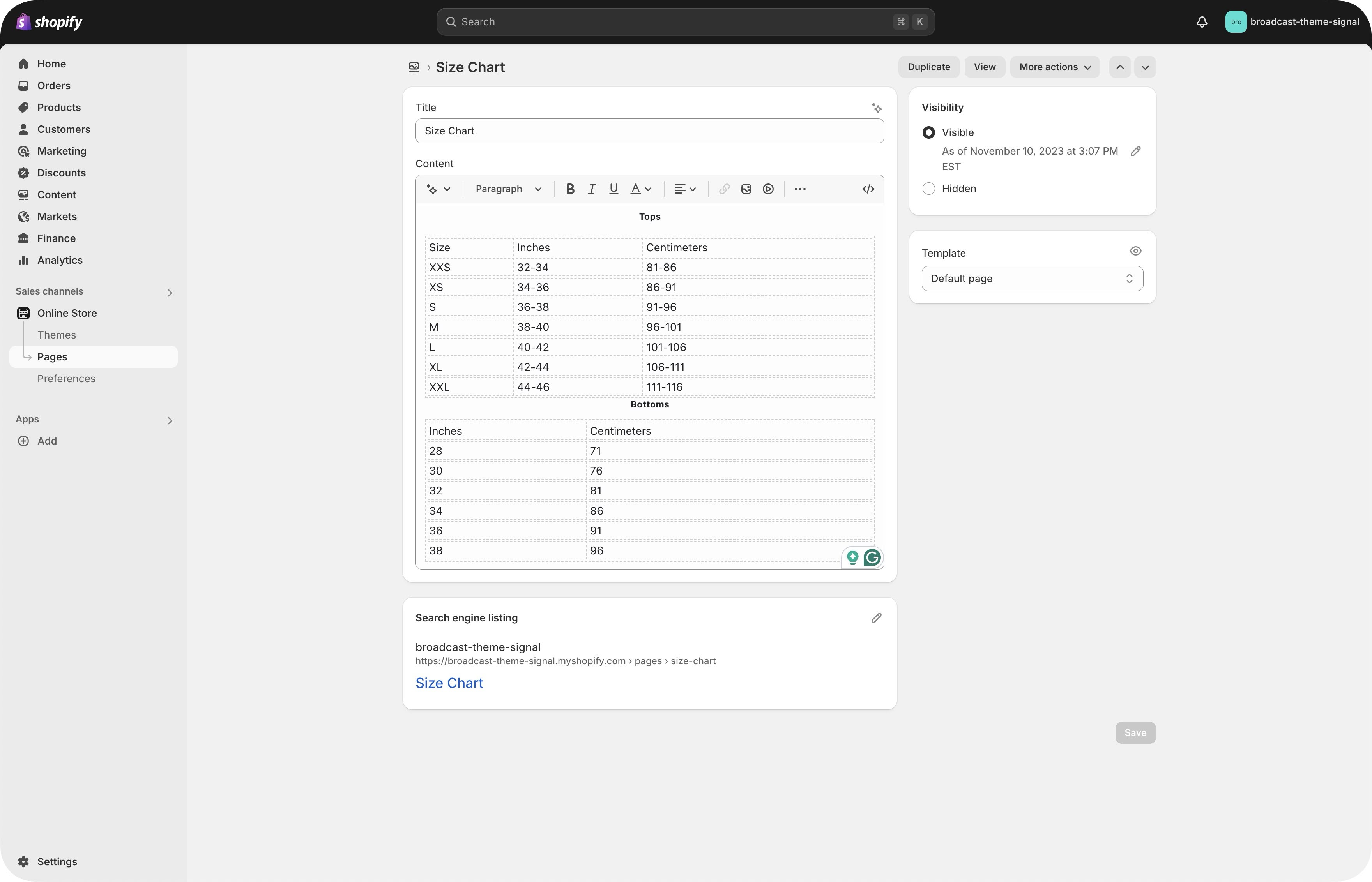 To start, you'll need to create your size chart pages. Broadcast will utilize Shopify's built-in Pages feature to display the size charts. If you already have an image of your size charts, you can simply upload it to a Shopify page.&#x20;