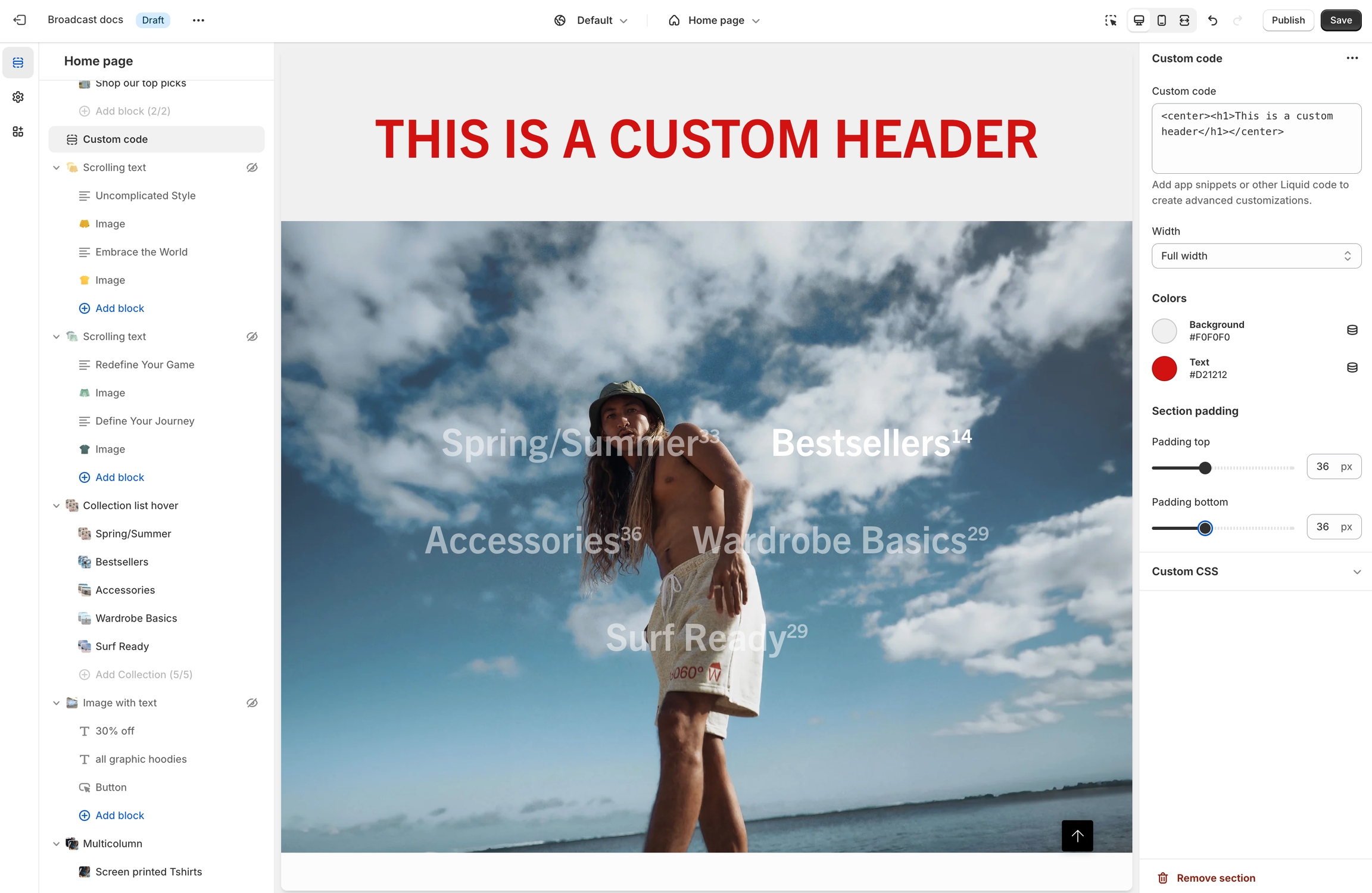 Broadcast includes a custom code section to help you add Shopify App snippets, HTML or other Liquid code to create advanced customizations.
