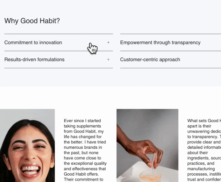 A quicker and simpler section to build FAQ-style questions and answers for your store. The Accordion group section can be used to add information about your products, services and even helpful tips. These are text-based accordions grouped into one section.