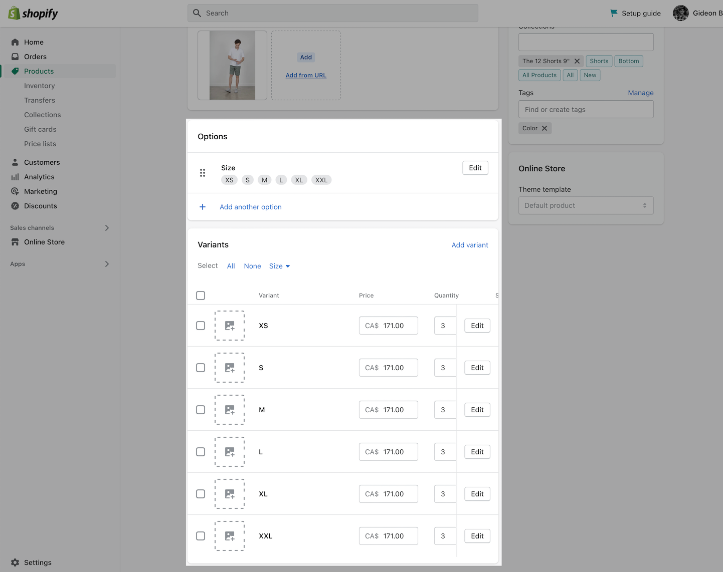 Tip: Create the first product with sizes and prices, then duplicate that product add new images, and adjust the description, inventory, and prices.