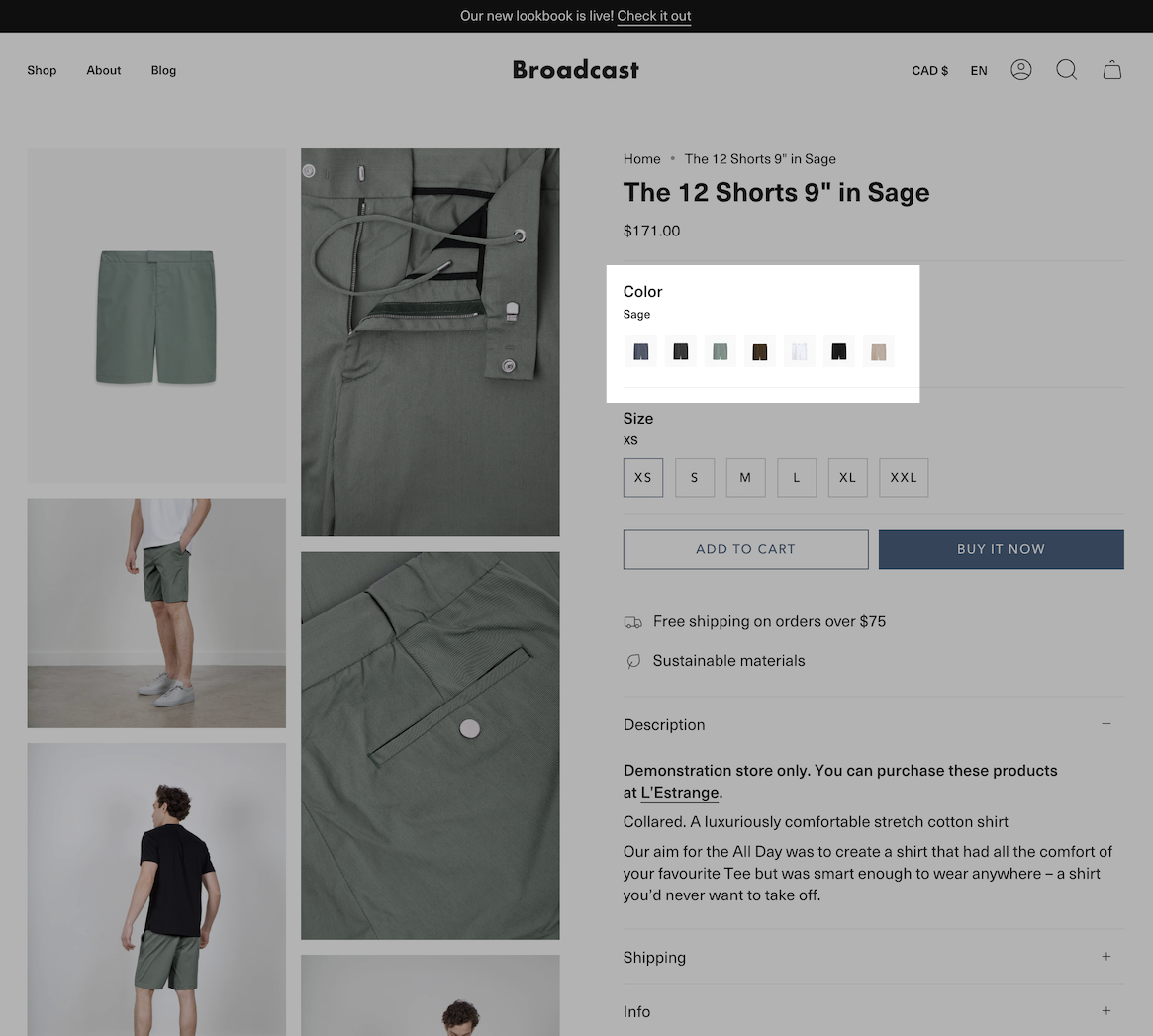 Each product can have its images, inventory, prices, description, and variants like Size: