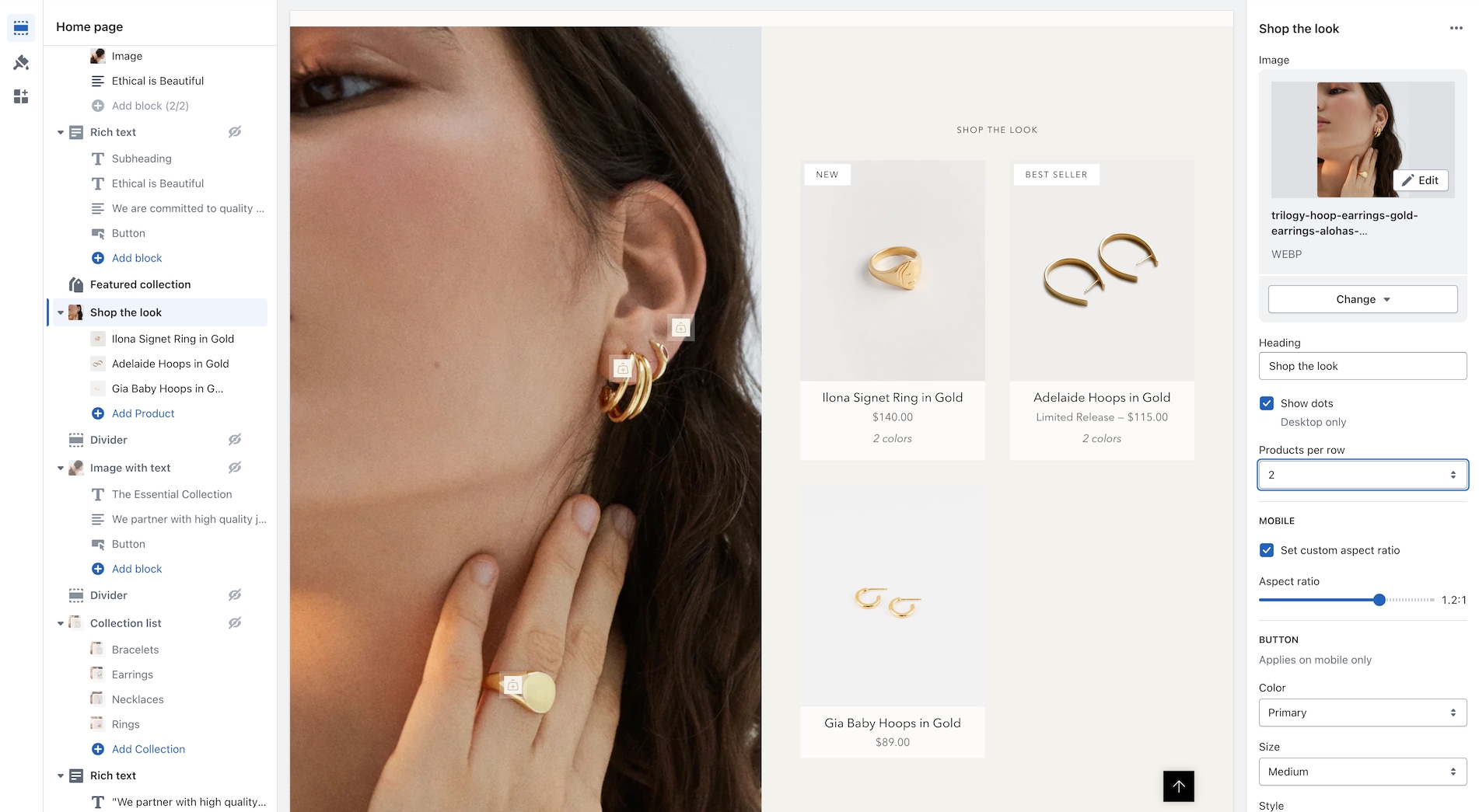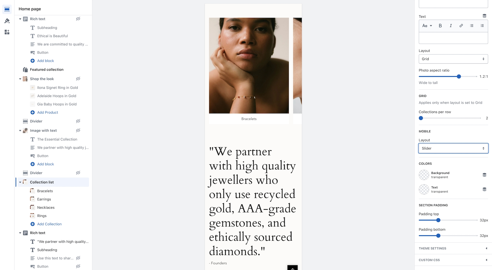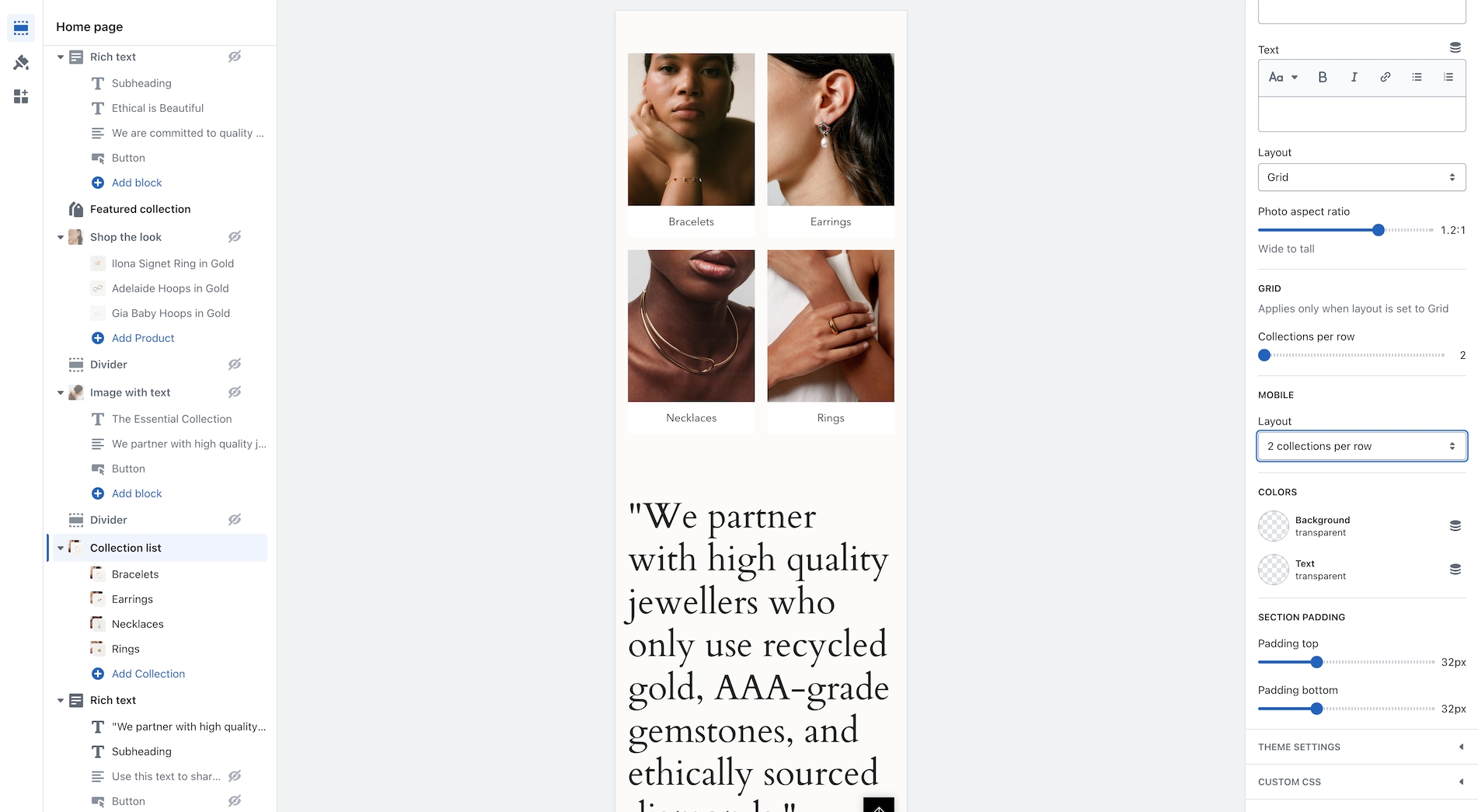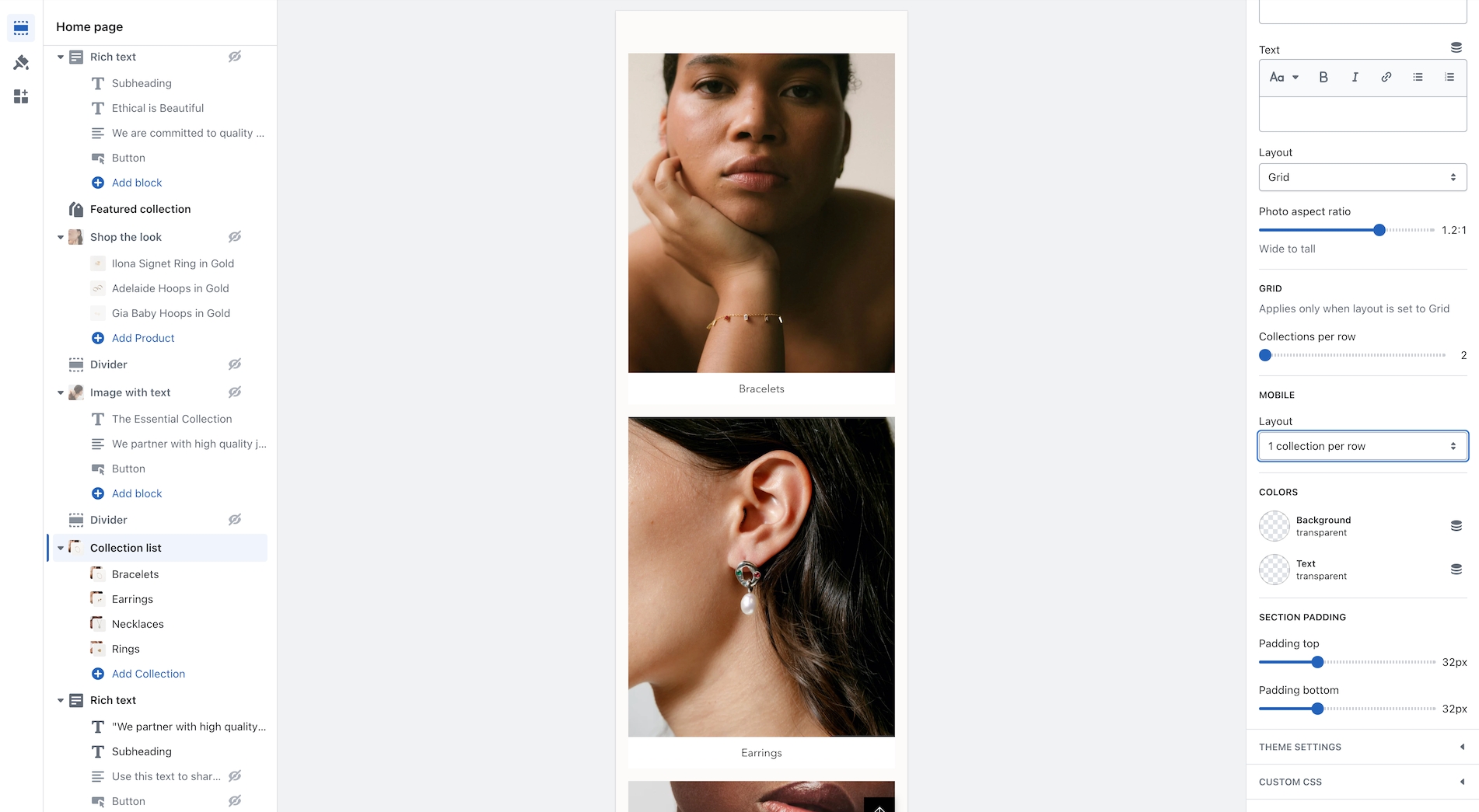 Broadcast now includes mobile layout styles for the Collection list section. You can choose to display 1 or 2 collections per row or the mobile slider: