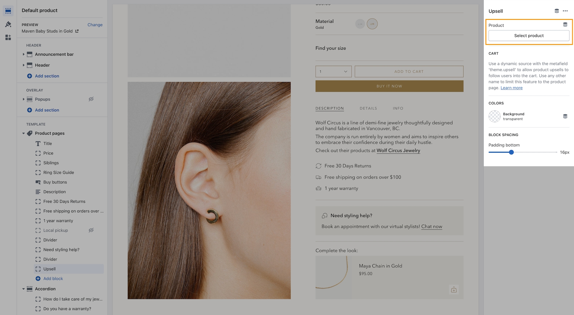 Now you can easily add one product right from the Theme Editor as your Upsell item which will instantly appear for all products using the same Product template.