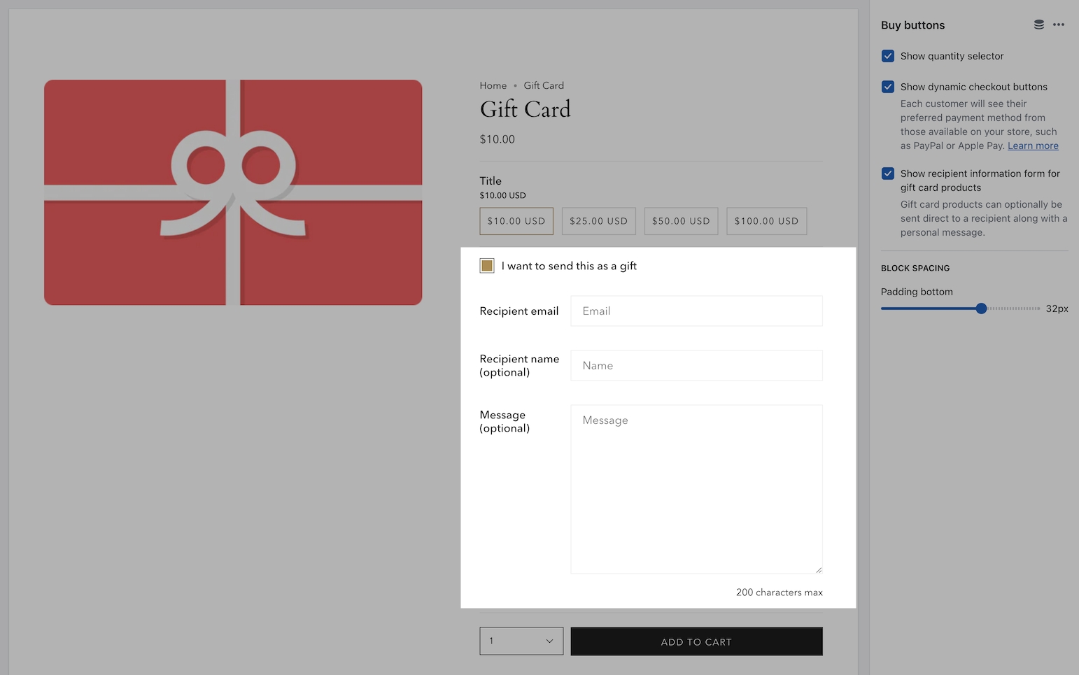 Customers can now send a gift card directly to the recipient's email and include a personal message.