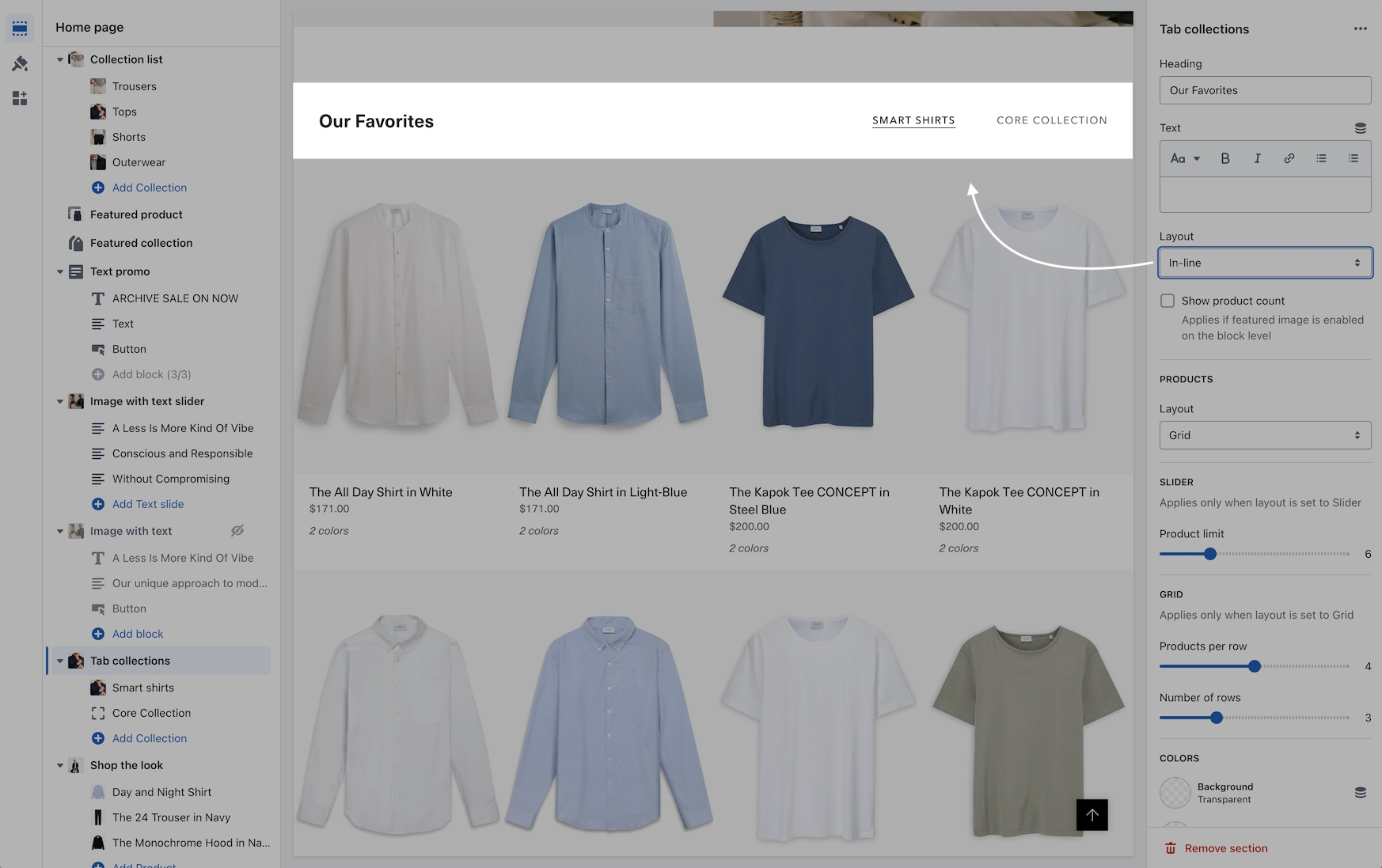 A new grid layout option for the desktop has been added for displaying the products within a tabbed collection. You can easily choose between the slider style or the new grid option: