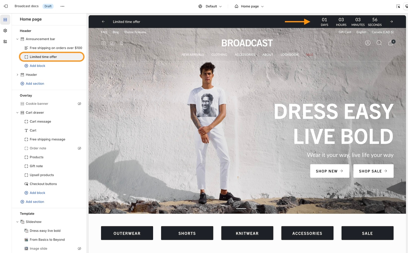 Add a sense of urgency right into the main announcement bar with the new countdown timer block: