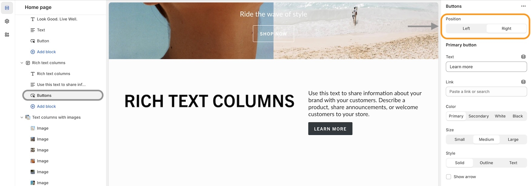 Each block has a position option for column placement: