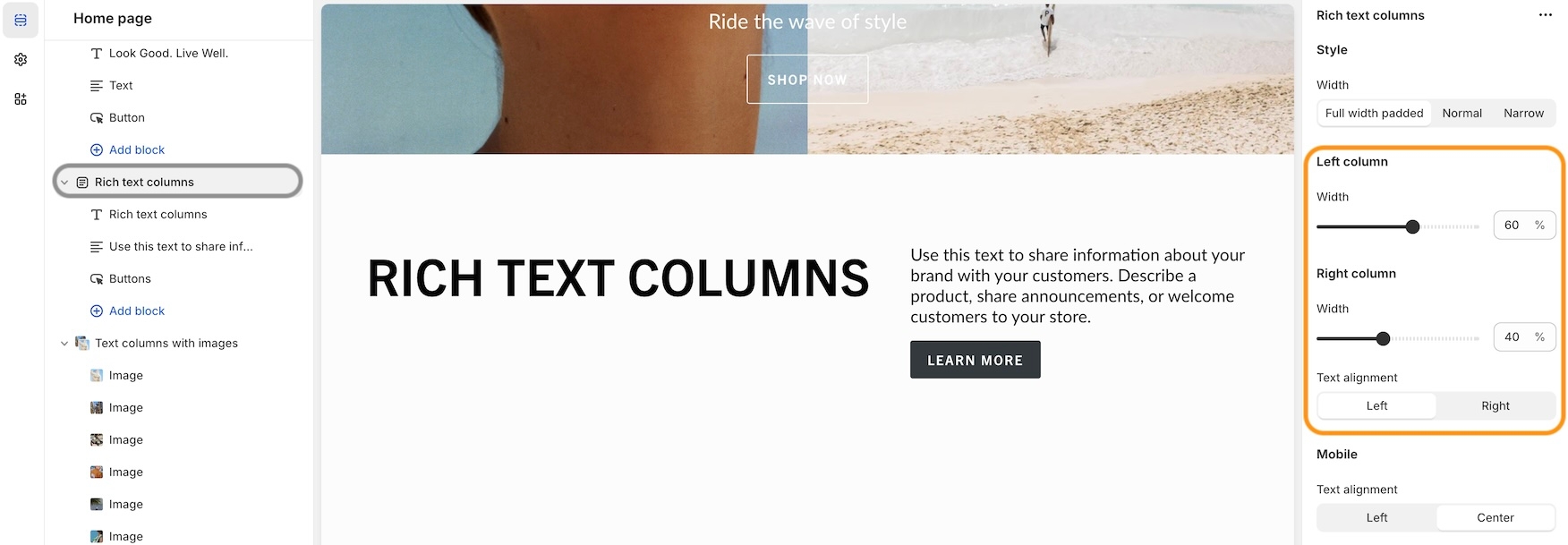 Column sizes and text alignment can be adjusted in the section settings: