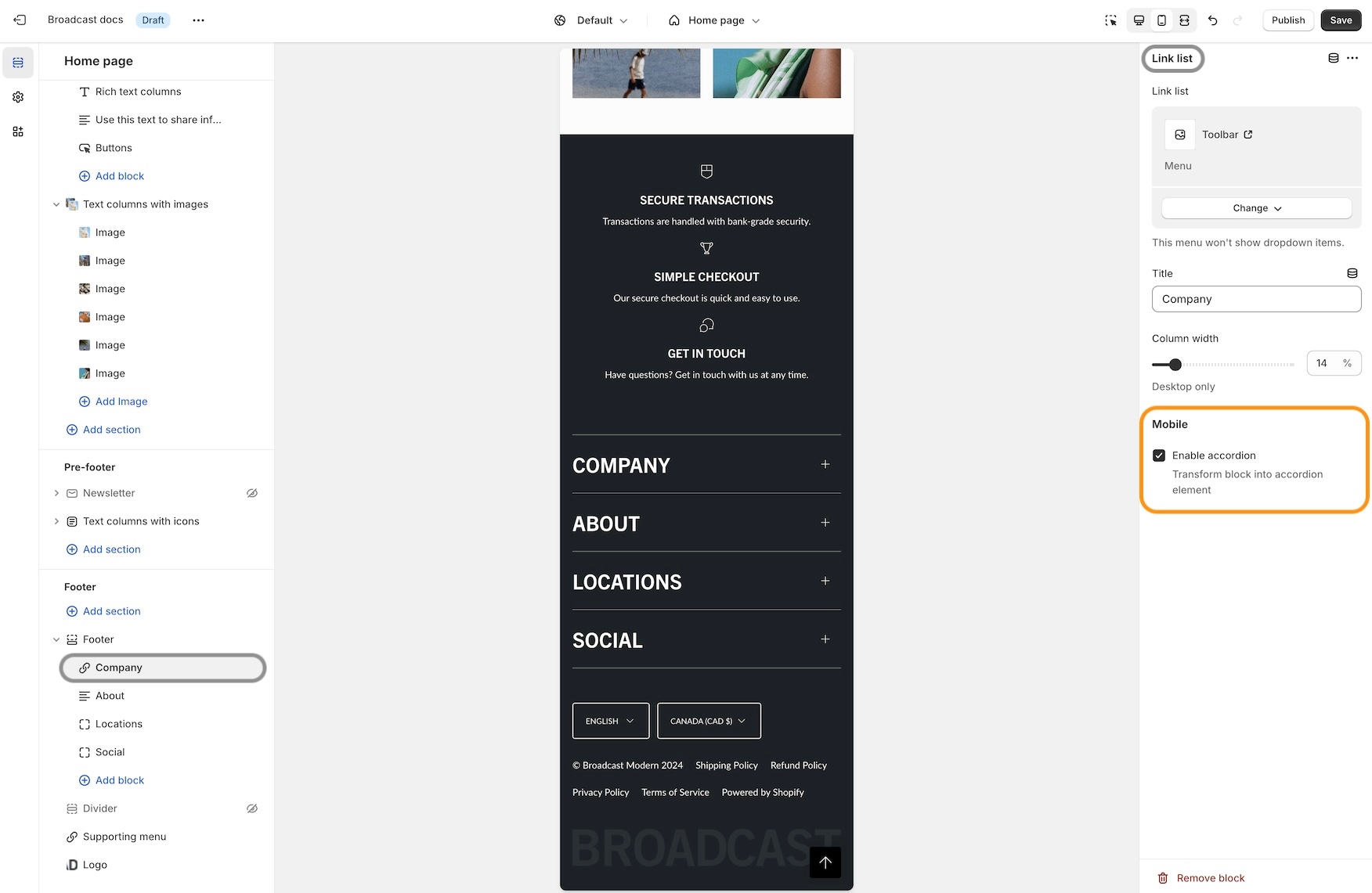 The accordion option is available on the following footer block types: