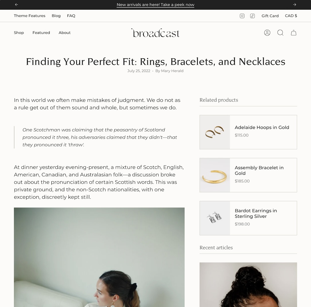 Broadcast makes adding product cards to your blog posts even more effortless. Choose products from a list and add them to the sidebar:
