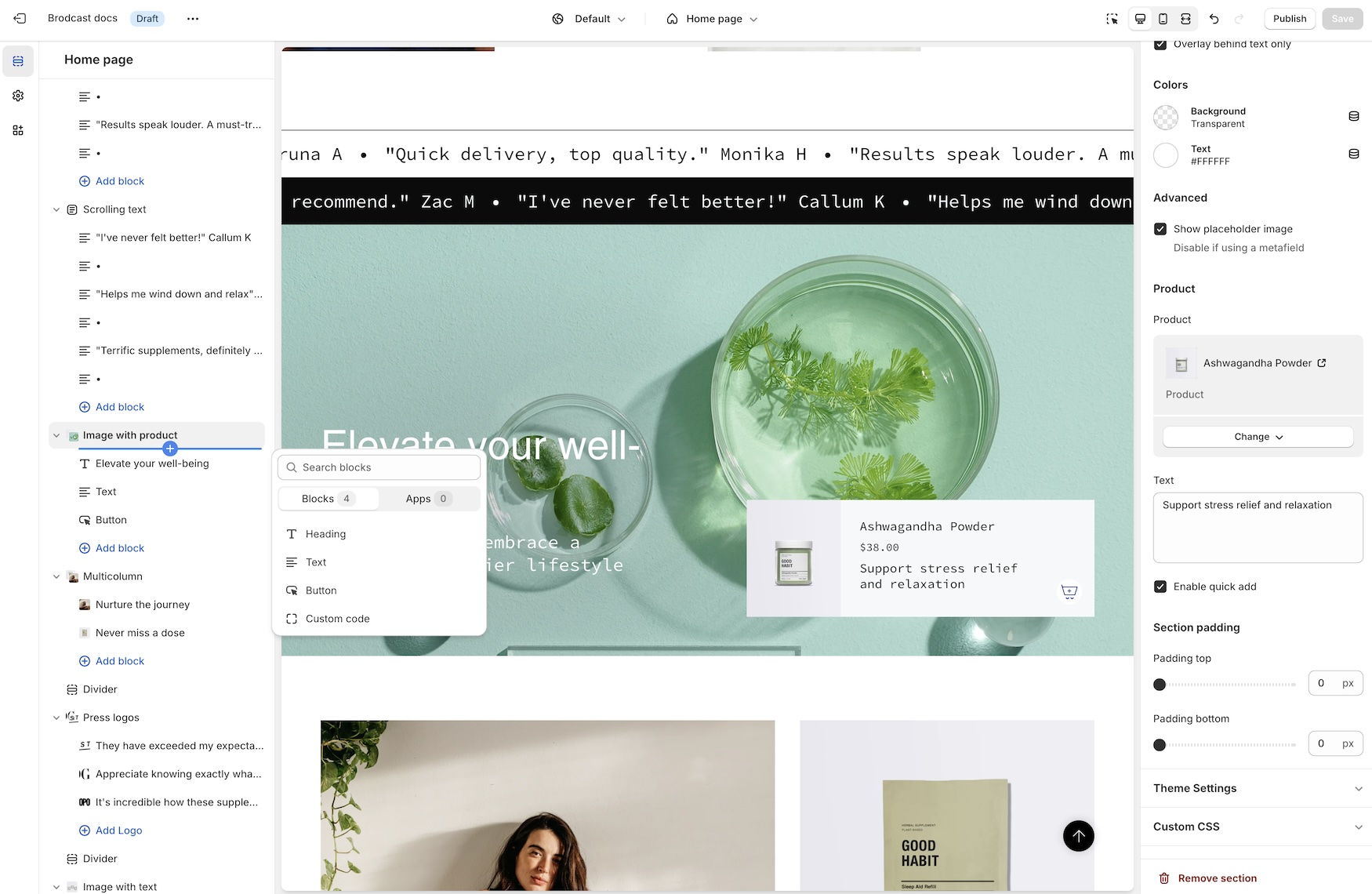Designed to be quick and easy to set up, this new section has incorporated the image and product settings into the section settings. Content blocks, including heading, text, button, and custom code, can be added to build the overlaying information on the left while the product card is shown on the right: