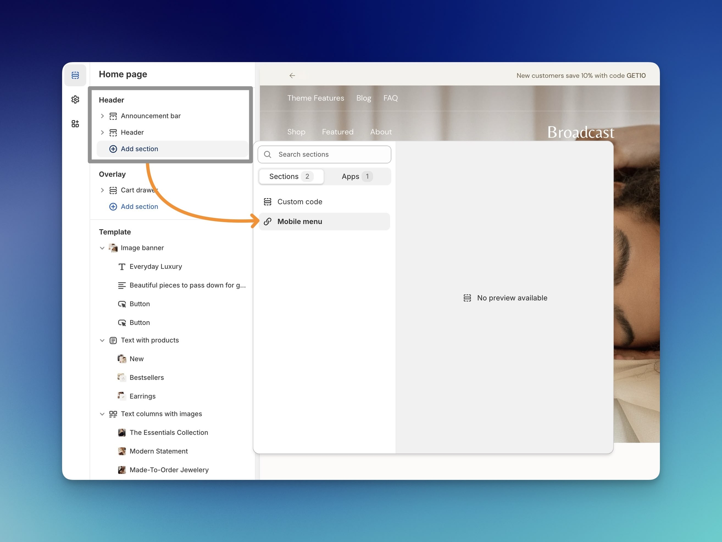 Add the new "Mobile menu" from the Header group. Use the "Add section".