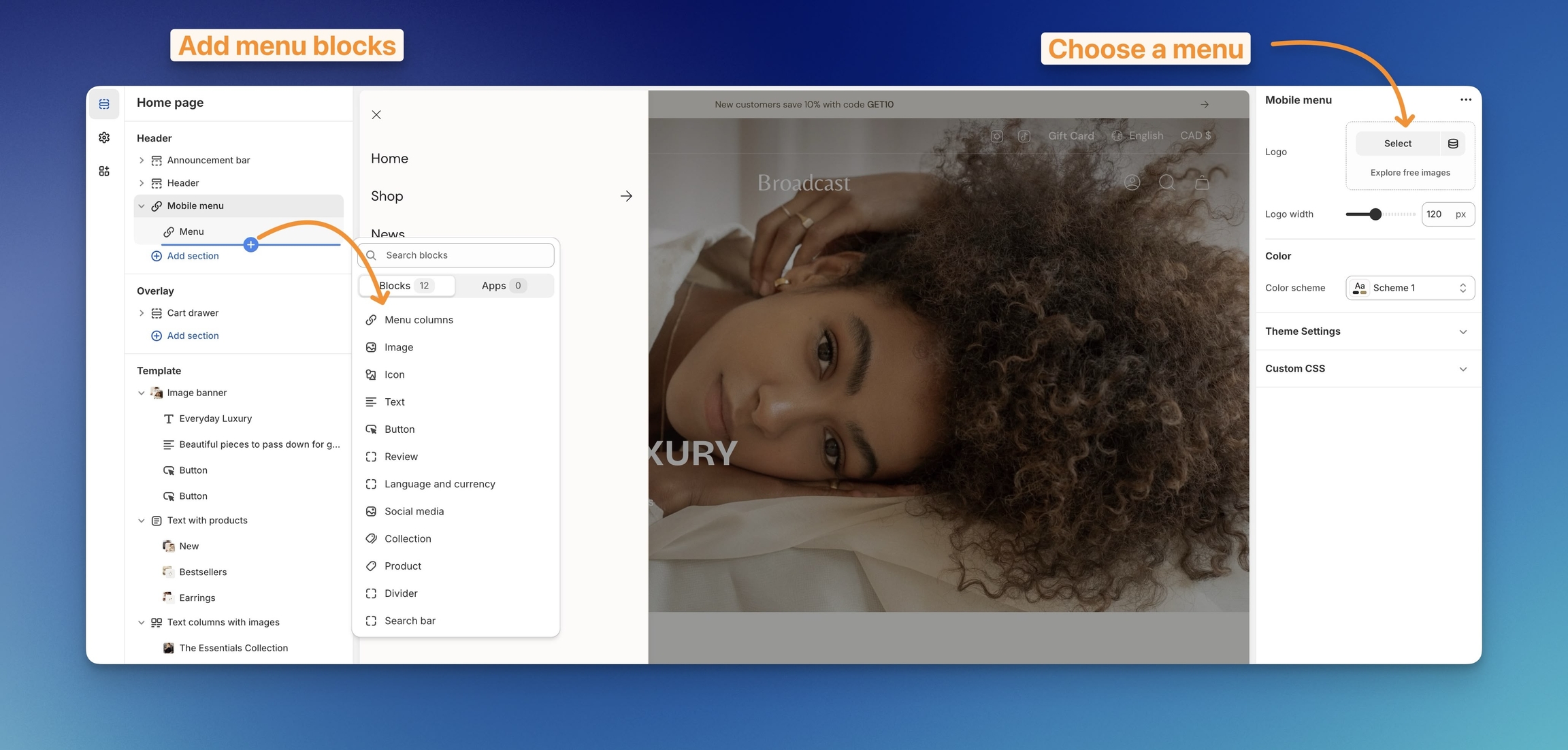 Now, with Broadcast 6, you can build a custom mobile navigation directly from the Theme Customizer. The mobile menu uses blocks to manage content easily for mobile designs: